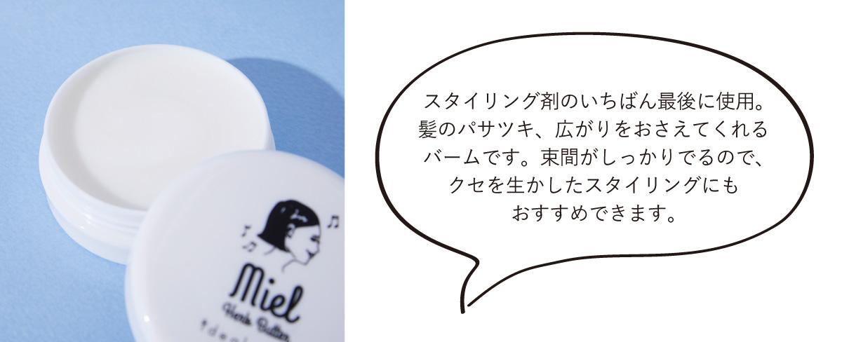 ダメージが気になるので、シャンプー&コンディショナー以外で補修できるヘアケアアイテムを探していました。 【Sans Ceuticals】pH+ Shine Corrector は髪のpHを整え、蓄積した不要なミネラルを除去すると同時に、キューティクルを補修してくれるスプレータイプのトリートメント。シャンプー後、タオルドライした髪にスプレーをプッシュ、その後いつものトリートメントを塗布します。アウトバスでは硬めのテクスチャーの 【miel】ハーブバター を。髪に艶と束を出しながら、ほどよくホールドしてくれます。