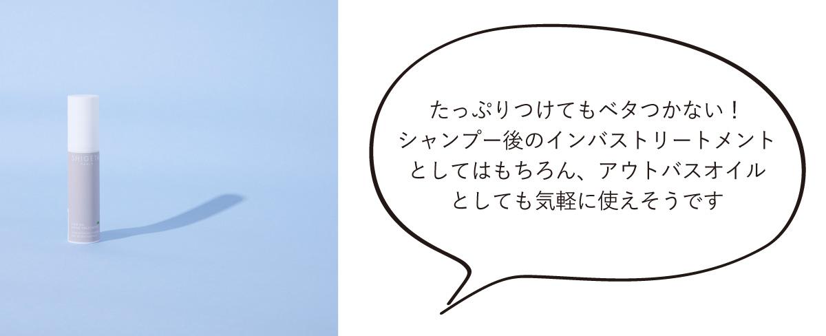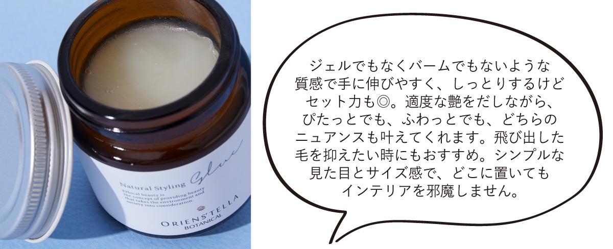 ナチュラルな香りが心地良い 【SHIGETA】トリートメントヘアオイル は普段使いに最適。アルガンオイル、アボカドオイル、プルーンオイルなどがバランス良く配合され、しなやかな手触りに仕上げてくれます。アウトバストリートメントとして、朝のスタイリングにも便利な一本です。 【ORIENSTELLA】ナチュラルスタイリンググルー 60g はワックスでもない、オイルでもない、クリームでもない、新感覚のテクスチャー。オリーブ果実油の働きで水分を抱え込み高い保水効果を発揮してくれます。