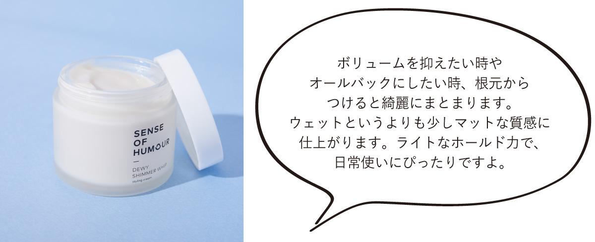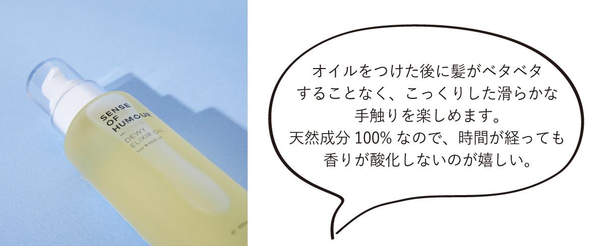 【SENSE OF HUMOUR】のデューイエリクシアオイル 100ml にはいつも助けられています。艶、ダメージ補修、紫外線対策などなど、まさに万能(エリクシアの意)!広がりやすい方は濡れている状態で普段より多めに塗布。髪内部の水分量を守ってくれます。 【SENSE OF HUMOUR】デューイシマーホイップ は髪をピタッとタイトに抑えてくれる万能クリーム。10円玉大を手の全体に馴染ませ、顔まわりの髪につけ、クシでなでつけて使ってみてください。