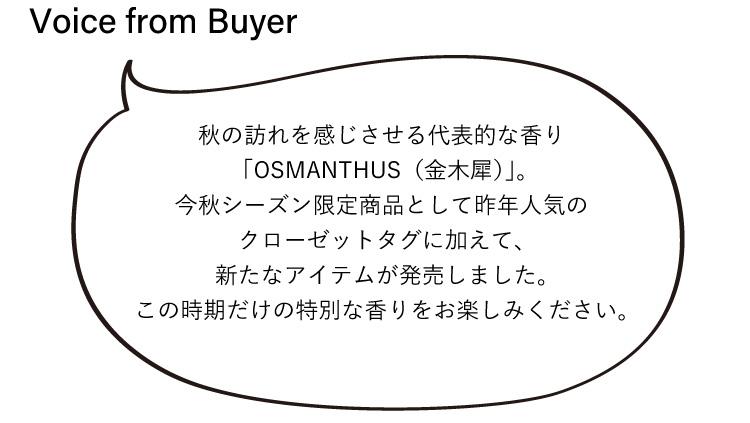 千葉県にある自社工場で、調合からパッケージングまでのすべての工程をハンドメイドで行う〈APOTHEKE FRAGRANCE / アポテーケフレグランス〉のフレグランスアイテム。豊富な香りのラインナップに、秋を感じる季節限定の「OSMANTHUS(キンモクセイ)」が登場しました。薬品瓶をイメージした遮光瓶に入っているのは、空間を香りづけるルームミストスプレー。オーガニックの大豆100%のロウを使用したフレグランスキャンドルは持ち運びにも適した蓋付きなので、旅行先で楽しんだり、ギフトにもぴったりなアイテムです。