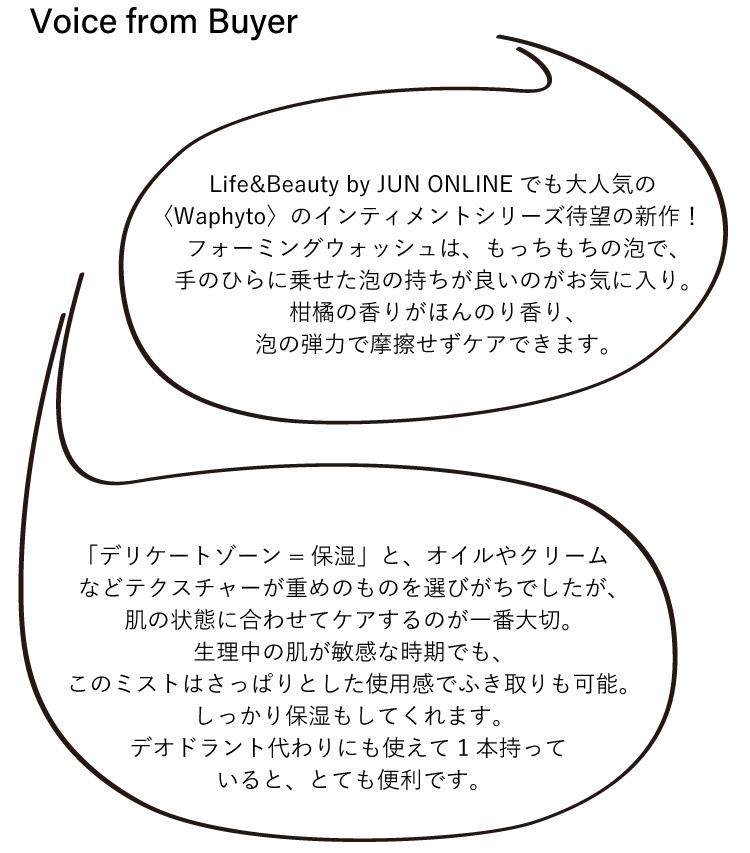 〈Waphyto(ワフィト)〉より、デリケートゾーン用ケアアイテムをご紹介。毎日のお手入れには、ワンプッシュでもっちり泡が出てくるフォーミングウォッシュを。ニオイ、くすみ、乾燥と悩みの多いデリケートゾーンを優しく洗い上げ、バストやワキなどのケアにもおすすめです。日中のお手入れには、持ち運びしやすいインティメイトミストをバッグにイン。逆さにしても使えるきめ細かなミストで、外出先での汗やムレ、気になるにおいを取り除き、肌環境を整えます。
