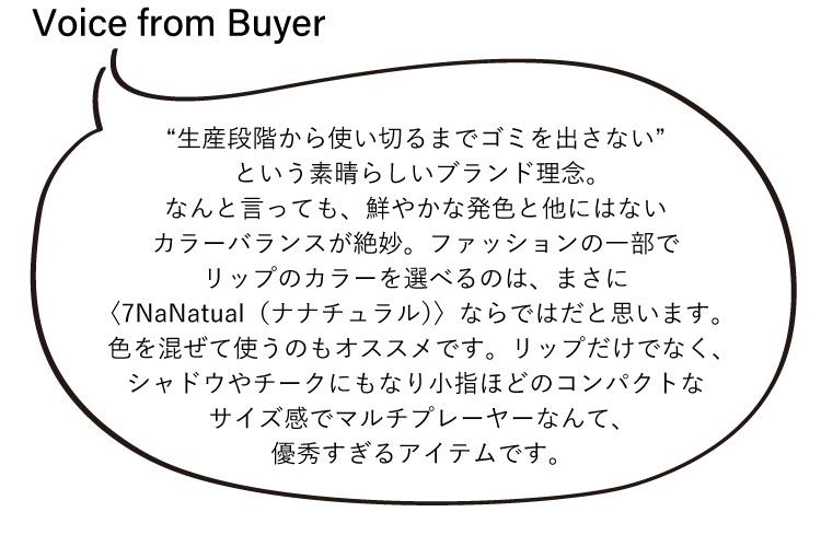 ひと、社会、地球環境が抱える7つの課題解決を目指した日本発のクリーンビューティーブランド〈7NaNatual(ナナチュラル)〉のアイテムが新たにラインナップ。トレンドフリーやケミカルフリーなどの7項目を実現した、日本発の天然由来成分100%コスメです。ボタニカル保湿成分を配合したカラースティックは、「ダイダイ」や「キ」など、個性的ながらも唇の色に馴染む7色のカラー展開。うっすらとパールが配合されているのでアイカラーとしても活躍すること間違いなし。使い切りやすいミニサイズは、地球にもやさしく、持ち運びにも便利なんです。