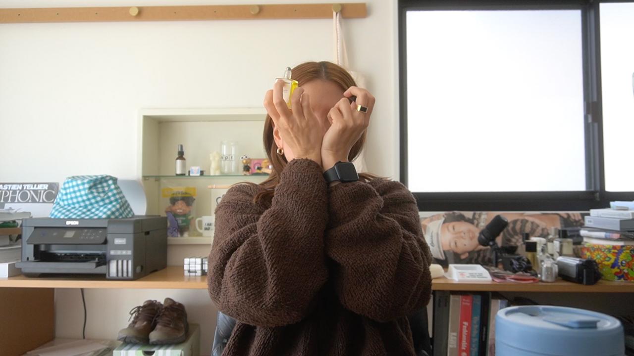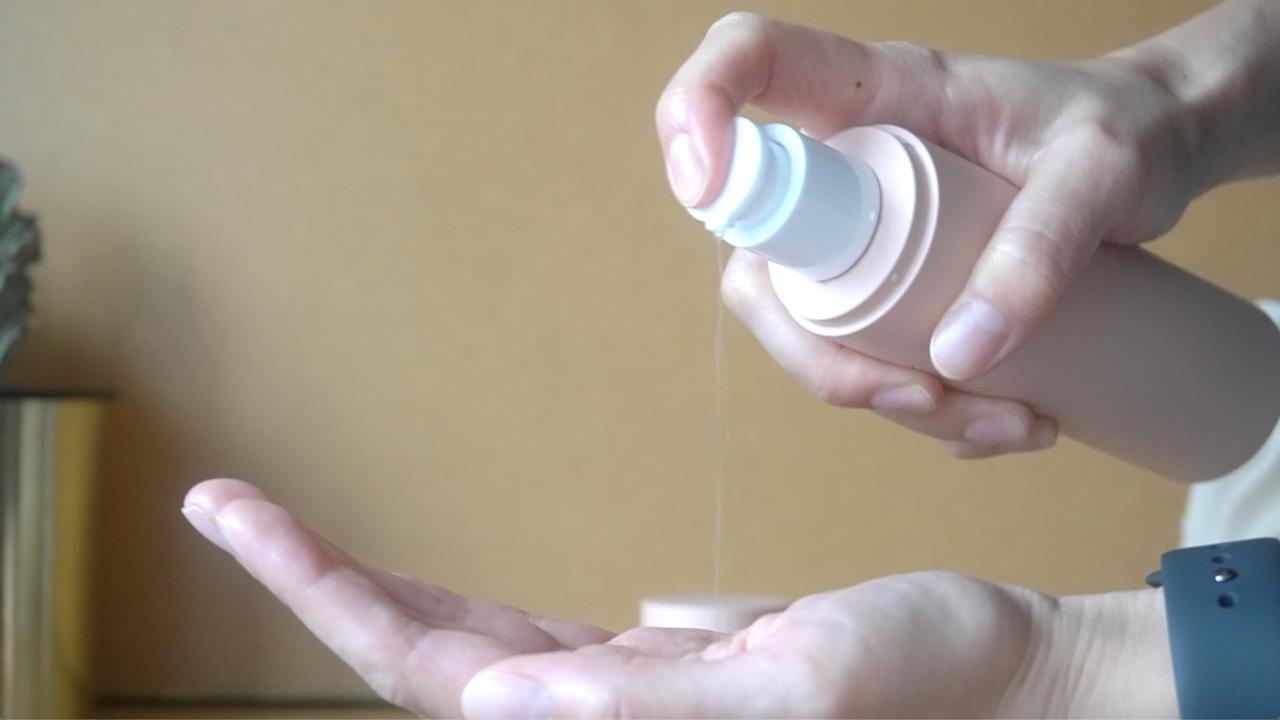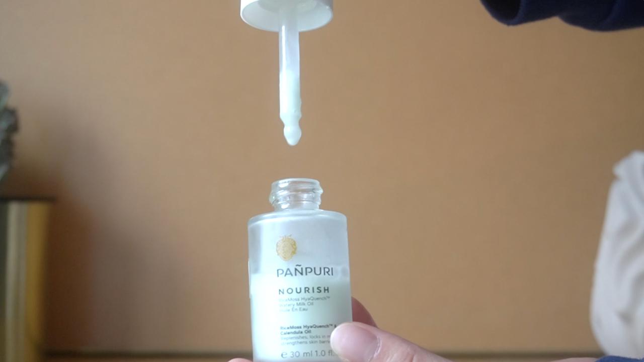 「そして次が、ミルクオイルです。私、プレ美容液みたいなものがすごい好きでよく使ってるんですけど、今年はね、このプレセラムが結構ヒットしました。カレンデュラオイルと美容液が二層になっているので、これをしっかり振ってミルク状にして使います。私はスキンケアのステップが結構多いほうなんです。化粧水、プレ美容液、美容液、その後また美容液を重ねることもあるし、パックをすることもあるし、クリームやアイクリームを塗ったりも。だから、ひとつひとつのアイテムはあまり重くないものが好みで、このプレセラムはね、オイルなんだけど使用感はベタつかないし重たくないので、でもしっかり潤いを閉じ込めてくれる感じですごく好きです。これからの季節は乾燥が気になるので、活躍してくれると思います」