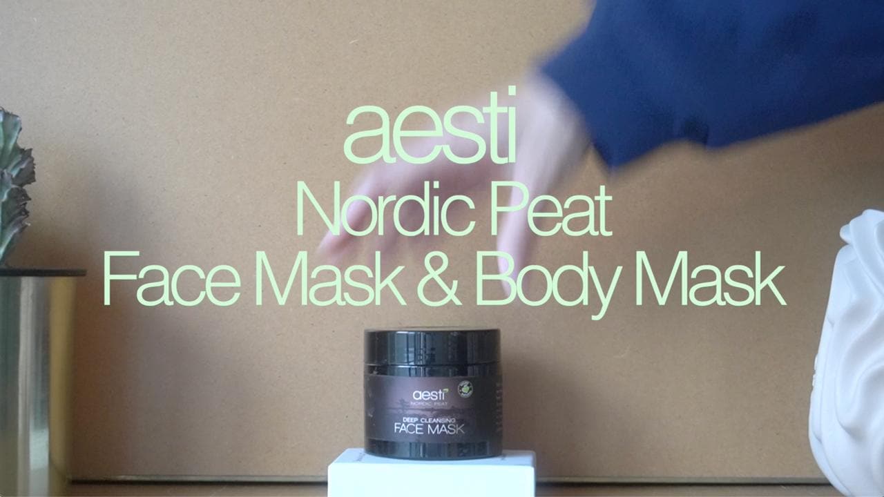 「そして、次が〈aesti(アエスティ)〉のフェイスマスクとボディマスクです。そもそも、この『Peat(ピート=泥炭)』っていうのが何百年、何千年かけてゆっくりと植物が分解されてできた泥のことで、糖とかタンパク質、アミノ酸、ミネラル、ビタミンがすごく豊富なんです。いろんなクレイマスクを使ってきたけど、これほどトーンアップして肌がツルーンとなるマスクは初めてだったっていうくらい、これが私が使ってきた中ではNo.1だと思います。とくに小鼻の周りのプツプツとかが気になる人はぜひ使ってほしくて、体もそうなんだけど、本当に驚くほどつるっとして一層明るくなるというか、なんかね、スクラブとかするよりも本当に奥底から老廃物を取り除いてくれている感じがして、すごくおすすめ」