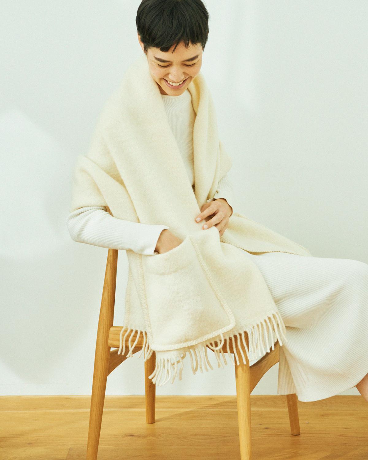 ブランケットのようなMARIA Pocket shawl (写真上)。スマホやお財布、鍵なども入ってしまう大ぶりなポケット付きなので、室内だけでなくワンマイルウェアとしても重宝。