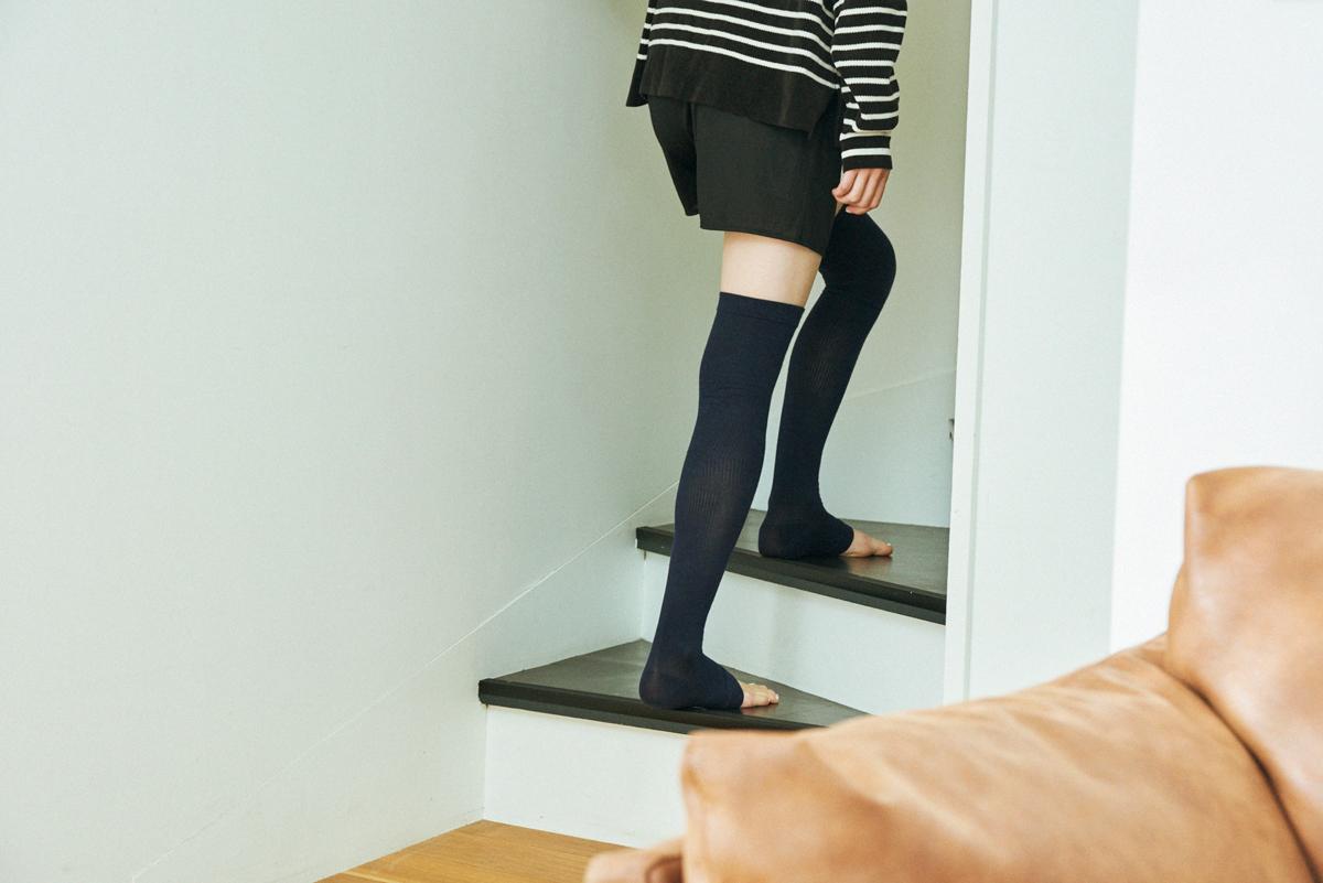 1日の疲れが溜まった足を膝、足首、ふくらはぎを程よい締め付けることでむくみケアしてくれる〈eume(イウミー)〉のめぐりソックスは就寝中に最適な設計。人体から発せられる遠赤外線をふく射することで、身体を温める“光電子®”繊維により、自然なぬくもりで蒸れにくく、快適に温まるのが特徴です。