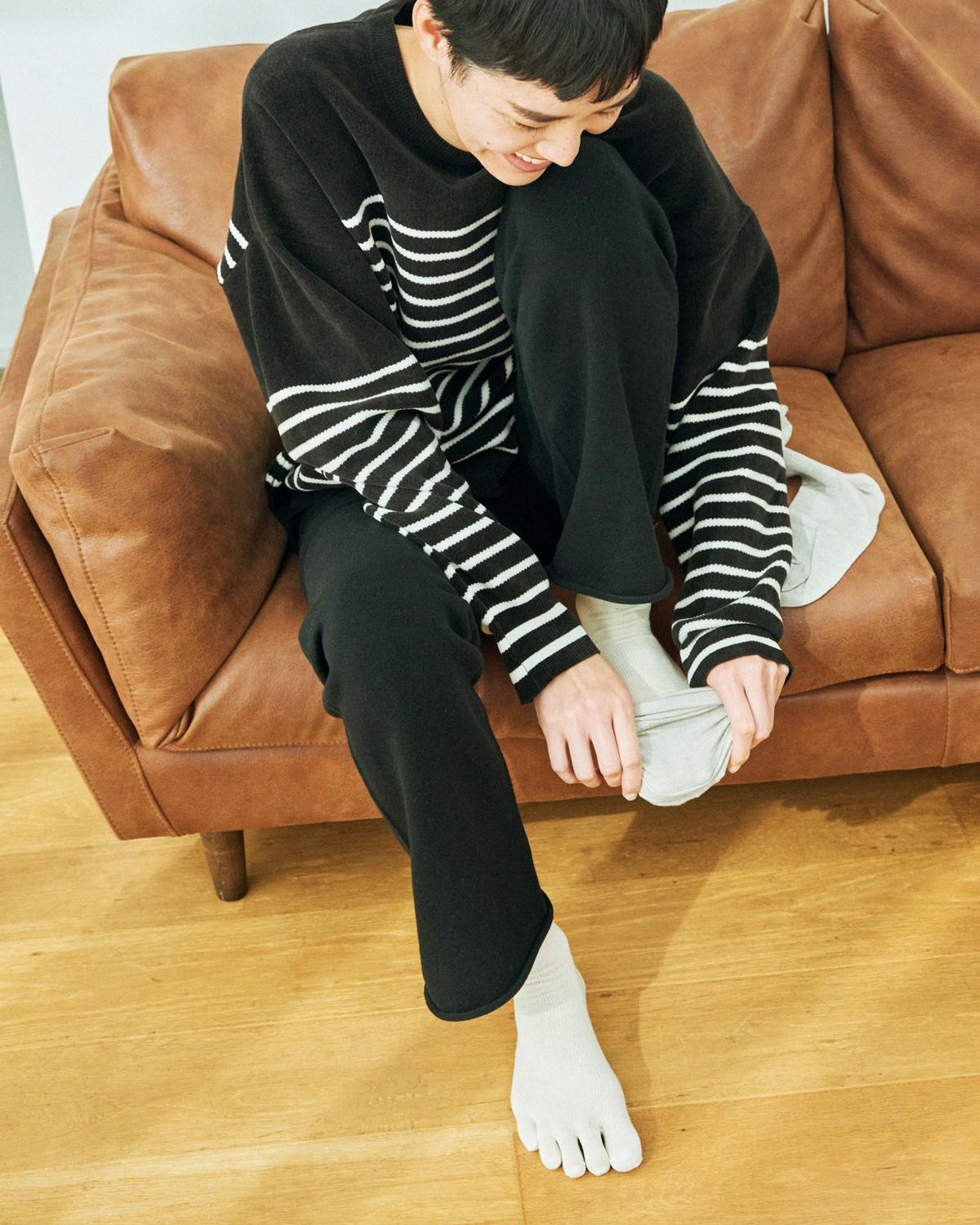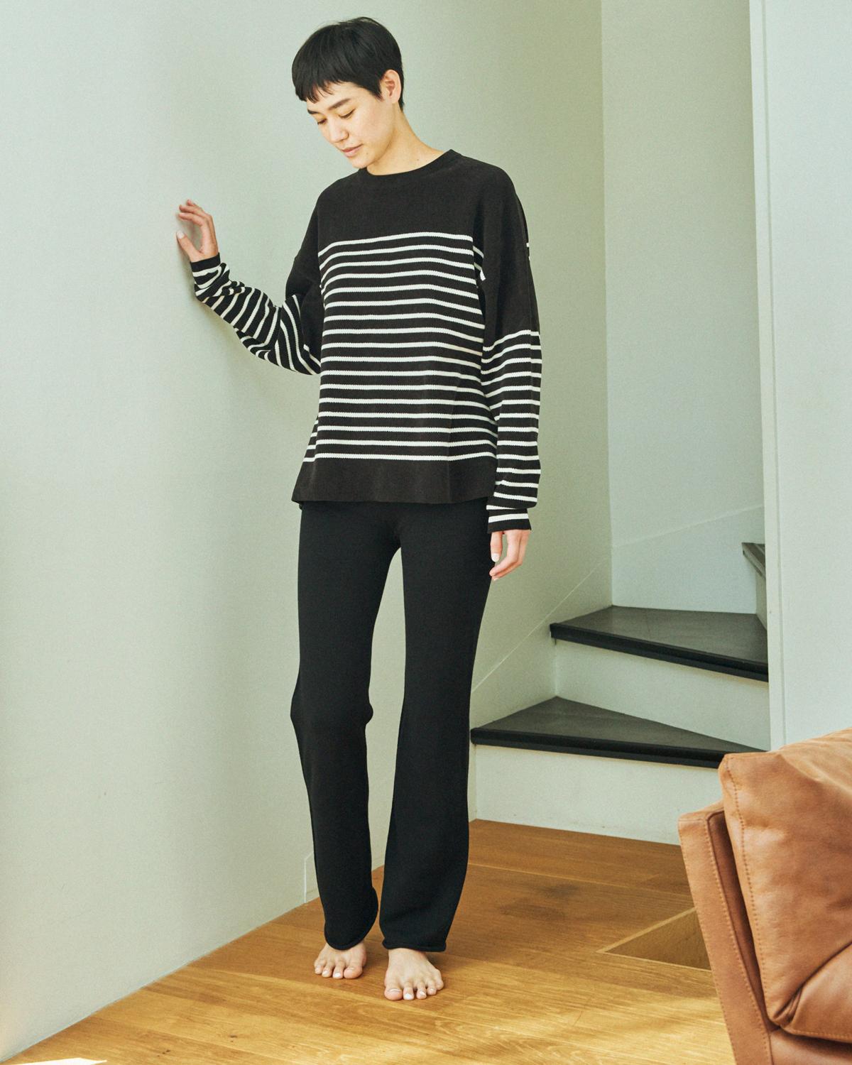 女性の悩みにフォーカスした〈WRAY(レイ)〉のハイウエストニットパンツは滑らかな肌触りが心地よいコットンシルク素材。胸下からの腹巻き効果もあり、気になるお腹周りの冷えをしっかりとカバー。お腹周りは心地よくフィットするのに、下半身のシルエットは拾いすぎないので、リラックスパンツにありがちなだらしなく見えることもなくスタイルアップも叶います。