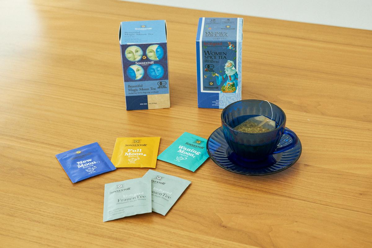 オーストリア北部の小さな村から生まれたハーブティーブランド〈SONNENTOR(ゾネントア)〉。オーガニック原料は手摘みされ、オーガニックの中でも特に希少とされるバイオダイナミック栽培による原料を可能な限り使用。写真上は、新月・上弦・満月・下弦と月の満ち欠けに合わせて、オーストリアのチロル地方に数百年伝承されている月のサイクルと人体の関係を表した「月のリズム法」を基にブレンドしたオーガニックハーブティービューティフル マジック ムーンティー。写真下は、女性の健やかな日々をサポートするブレンドの女性のためのお茶 ウーマン スパイス ティー。レシピはなんと800年前のドイツの修道女であり植物学者が残したレシピをもとにしているそう。