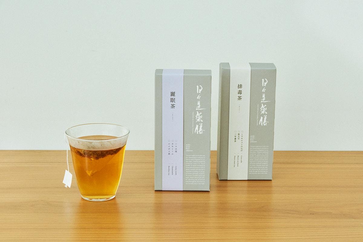日常の中に気軽に薬膳をというコンセプトのもと生まれた〈日々是薬膳(にちにちこれやくぜん)〉。心がざわざわした時や入眠前のリラックスに最適な麗眠茶(写真左)は、フルーティな味わいながらも後味もすっきり。黒豆ととうもろこしのひげの香ばしさを感じる番茶ベースの味の排毒茶(写真右)は、デトックスを促してくれる漢方がブレンドされたお茶。飲みすぎた日の翌日やむくみを感じる日にもおすすめです。