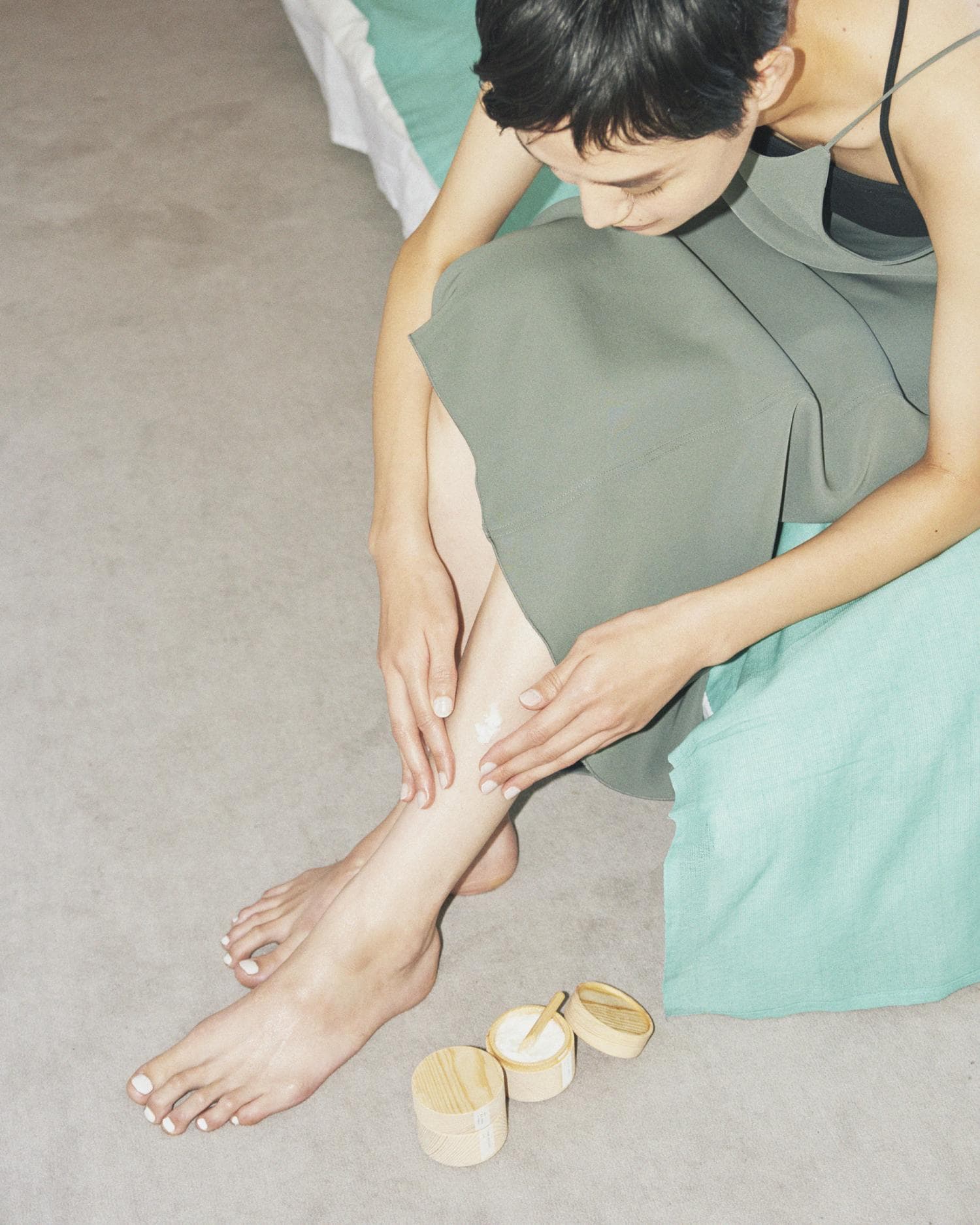 〈Mylo〉と同様に保湿力が高く、フットケアに適しているのがフィンランド発の〈HETKINEN(ヘトキネン)〉の「ボディバター」。水を使わずアーモンドオイル、シアバター、ココナッツオイル、ホホバワックスと、“保湿力オールスターズ集結”と言いたくなる配合。緩む前は硬めのテクスチャーなので、必要な分を繰り出せる専用のスティック付き。どちらも手で温めてオイルを緩めながら使うタイプなので、踵を中心にマッサージしながら、足首からつま先まで優しく伸ばして。
