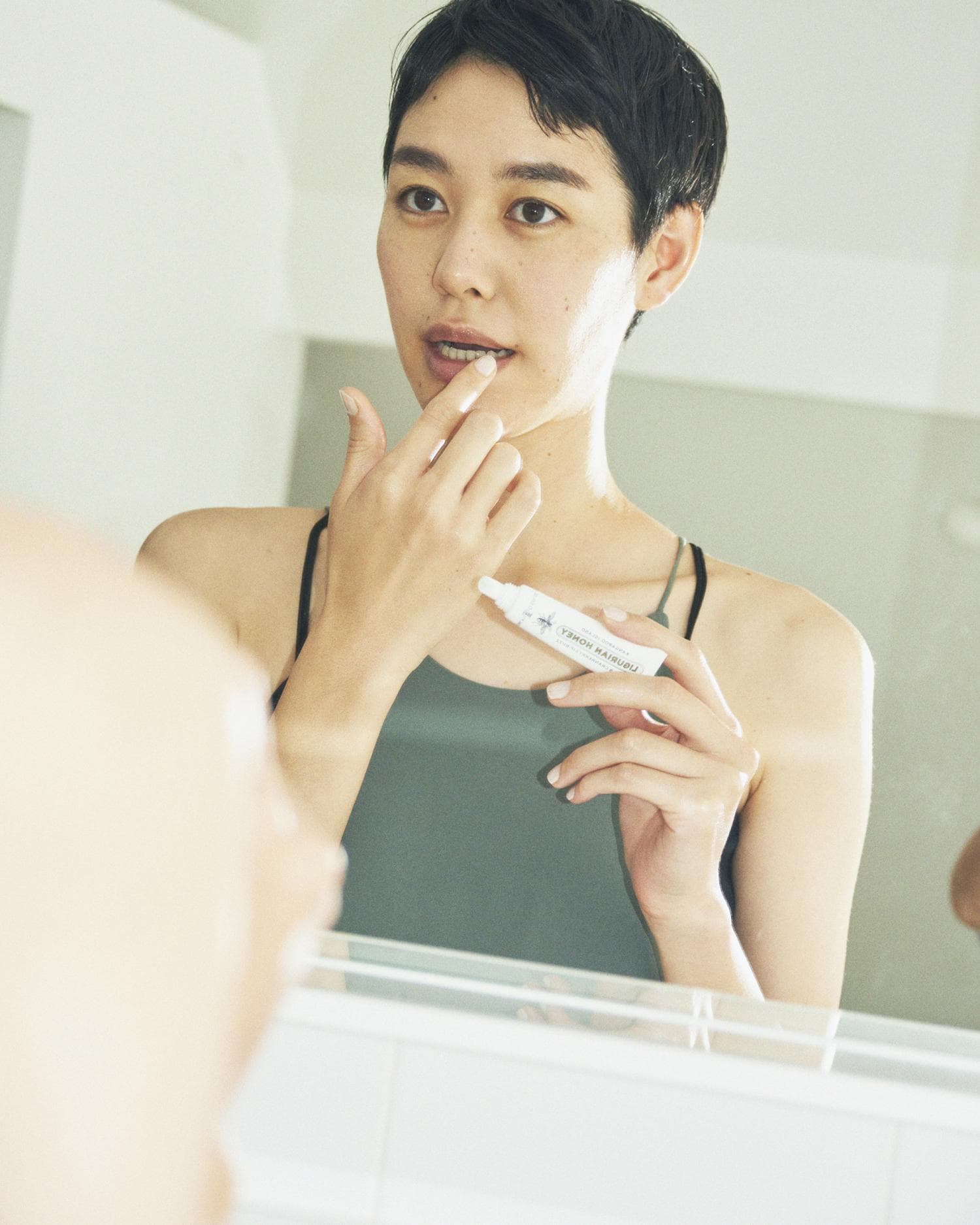 朝晩のケアだけだと、保湿がちょっと足りないのが冬のスキンケア。特に外的刺激にさらされる顔まわりは、ポケッタブルなサイズのフェイスバームをバッグやポケットに忍ばせて、乾燥が気になる時にこまめなケアをすることで、小皺などの予防にもつながります。ハニー&クランベリーの香りも楽しめる〈MAINE BEACH〉のリップバーム。ビーワックスやリグリアンハニーなどによる保湿で、乾燥しがちなリップもぷるぷるに。ワンハンドで手を汚さずにも使えます。
