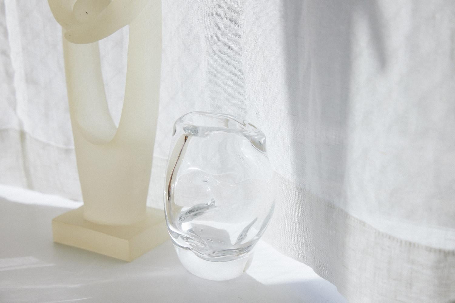 「透明で絶妙にへこんでいる形がかわいい。見る角度で表情が変わるので、いろんな方向から眺めて楽しめそう。お花はなるべくドライじゃないものを飾るようにしていて、この花瓶にはラン科のバンダを生けたいです。紫のお花がポンポンポンって3つくらい咲くので、一輪だけ挿してもいいかも。お気に入りのフラワーショップは『whole』です」