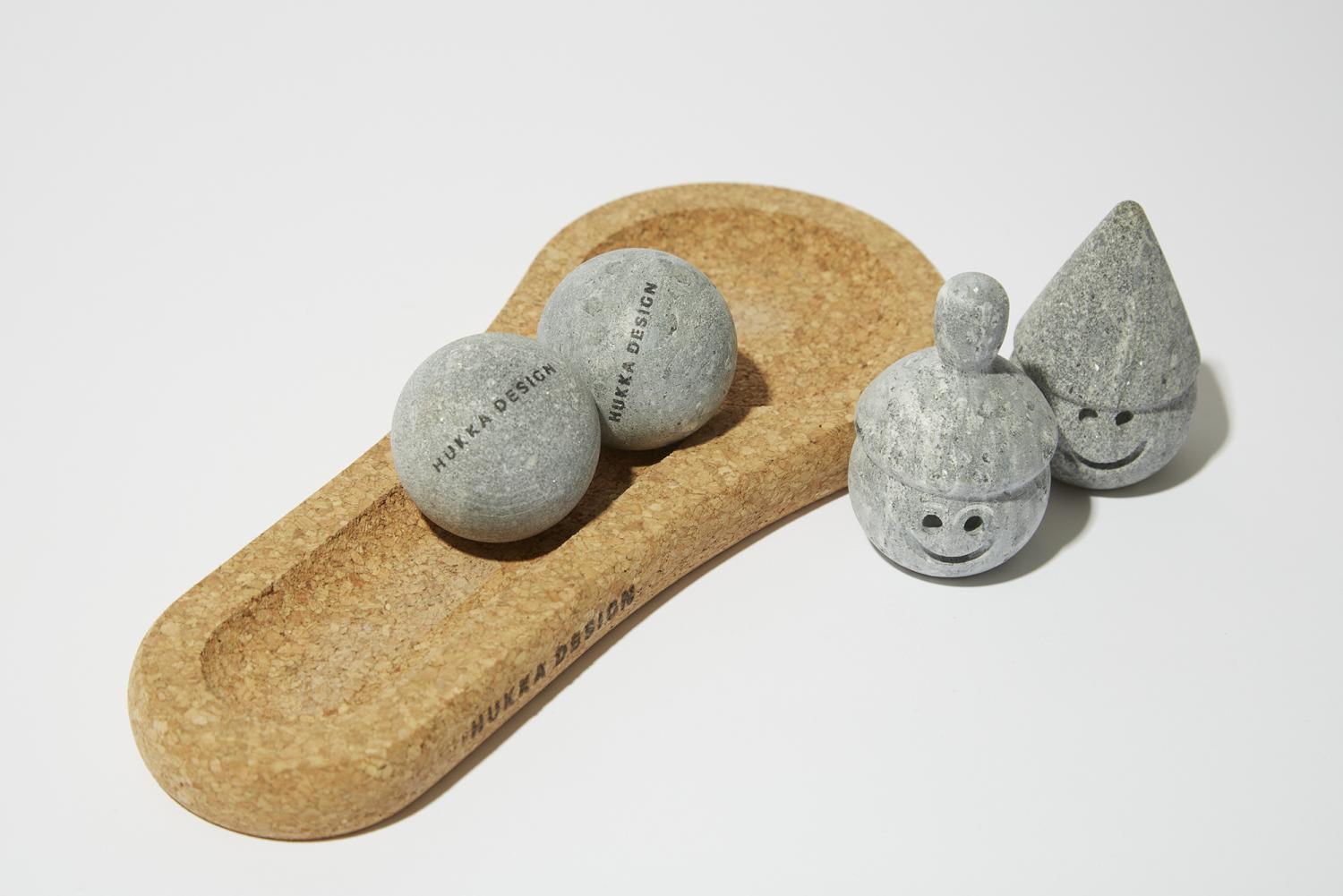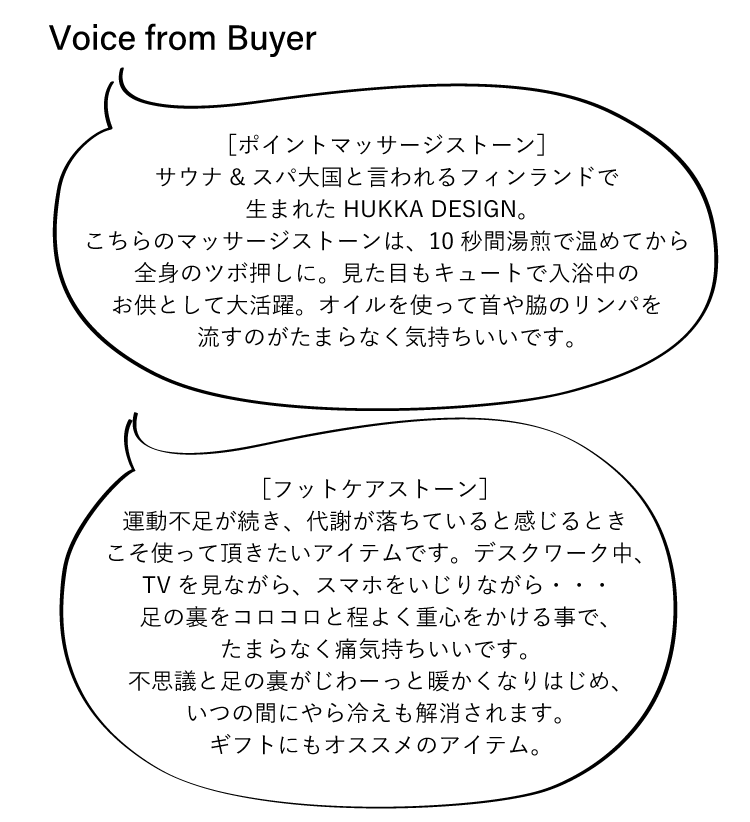 サウナの本場、フィンランドで生まれた〈HUKKA DESIGN(フッカデザイン)〉からマッサージストーンが登場!足型のコルクマットがセットになったフットケアストーン(写真左)は、足裏で転がすだけで脚全体にリラックス効果を与えてくれます。幸せを呼ぶといわれているサウナの妖精「サウナトントゥ」ELLI(写真中央)とTAHVO(写真右)は、頭のとんがった部分で手軽にツボ押しができる、笑顔がキュートなマッサージストーン。転がしたり押し当てたりと全身をほぐせるマッサージストーンは、繰り返し使えるので、温めて血の巡りをより良くしたり、冷蔵庫で冷やしてむくみ取りとして使うのも効果的です。
