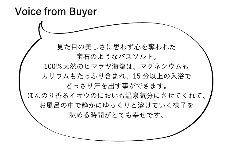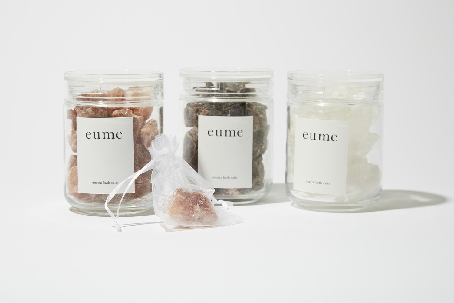 透明のガラス瓶に詰め込まれた宝石たちは、〈eume(イウミー)〉のクオーツバスソルト。マグマの高熱によって固められたミネラルの結晶は、体を芯から温める100%天然の岩塩。睡眠不足が原因で起こる日中の眠気や集中力の低下、過食などをバスタイムで改善。使い方は簡単で、瓶から取り出したバスソルトを付属の巾着袋にインして、一緒に湯船に浸かるだけ。眠りやすい体をつくるために、入浴時はバスソルトで全身を温めて、睡眠と深く関わる健康的な体温リズムをしっかり作ってあげることが大切です。