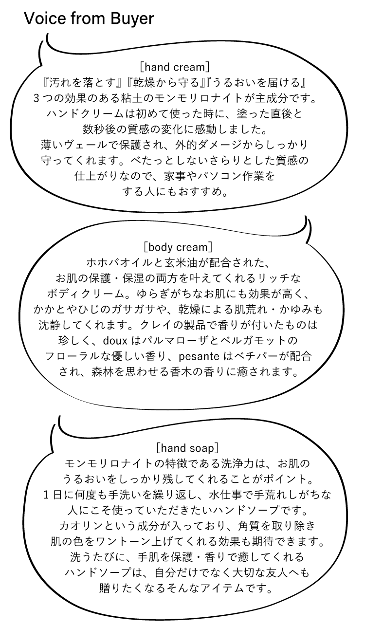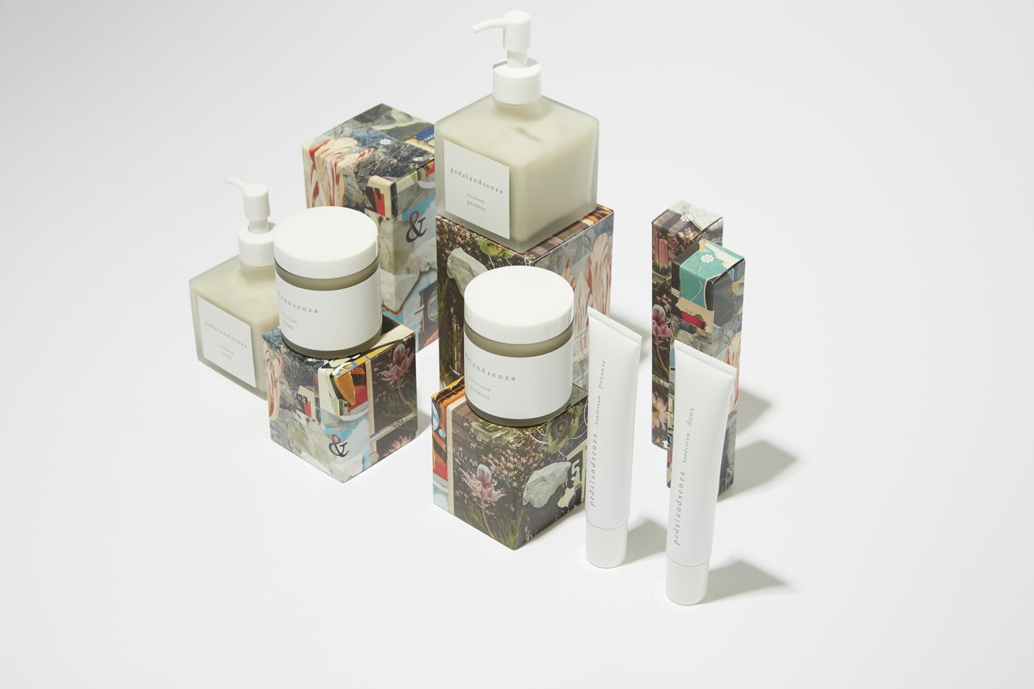 水分をたくさん含んで膨らむ粘土「モンモリロナイト」に、香り豊かな花を纏った〈pedalandsenza(ペダルアンドセンツァ)〉のアイテムが登場。汚れを落とすハンドソープと、うるおいを届けるハンドクリーム、乾燥から守るボディクリームがラインナップ。ユニセックスな2種類の香りは『edenworks』のフラワークリエイター・篠崎惠美さんが監修。重々しさをイメージしたウッディーな香りの「pesante(ペザンテ)」と、ネロリの華やかな香りを目立たせやわらかさを表現した「doux(ドゥー)」の 2種が揃います。捨てられてしまうはずの本を貼り合わせてコラージュしたパッケージも魅力的で、贈り物にもぴったりです。