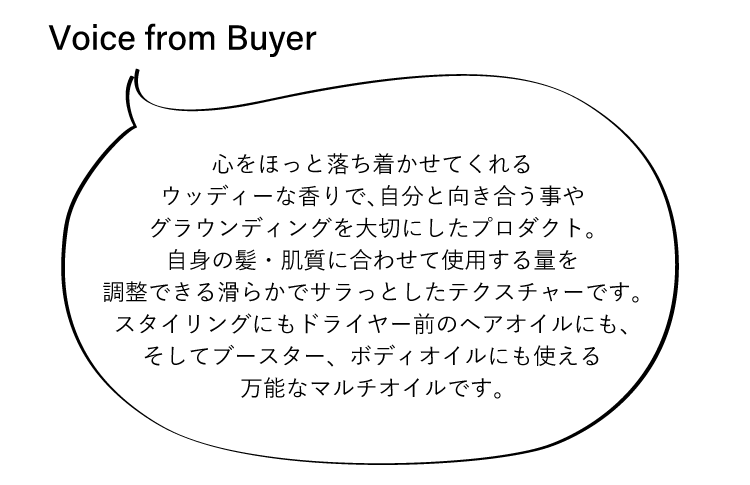 洗練されたウッディーな香りが漂う〈TAU(タウ)〉のマルチケアオイル。ビタミンEの50倍もの抗酸化力を発揮するコメヌカ油や、肌や髪の水分の蒸発を防いでやわらかくなめらかに整えるアルガンオイルなど、数種類のオイルを最適なバランスでブレンド。さらっとしすぎないテクスチャーで、乾燥しやすい部分のケアやマッサージオイルとしても全身に使えます。