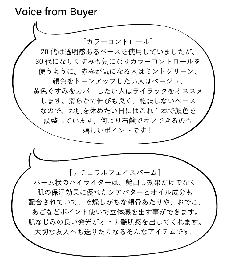 〈product(ザ・プロダクト)〉のメイクアイテムが登場!〈product〉のシグネチャーアイテムであるシアバターがベースの「ナチュラルフェイスバーム」は、バーム状のハイライト。しっとりと肌に馴染み、輝くようなツヤ感を引き出します。ブルーカモミール配合で肌荒れを防ぎます。肌個性に合わせた3色展開の「カラーコントロール」は、お肌の調子に合わせて、部分ごとに2色使いするのもおすすめ。メイクしながらスキンケアが叶います。
