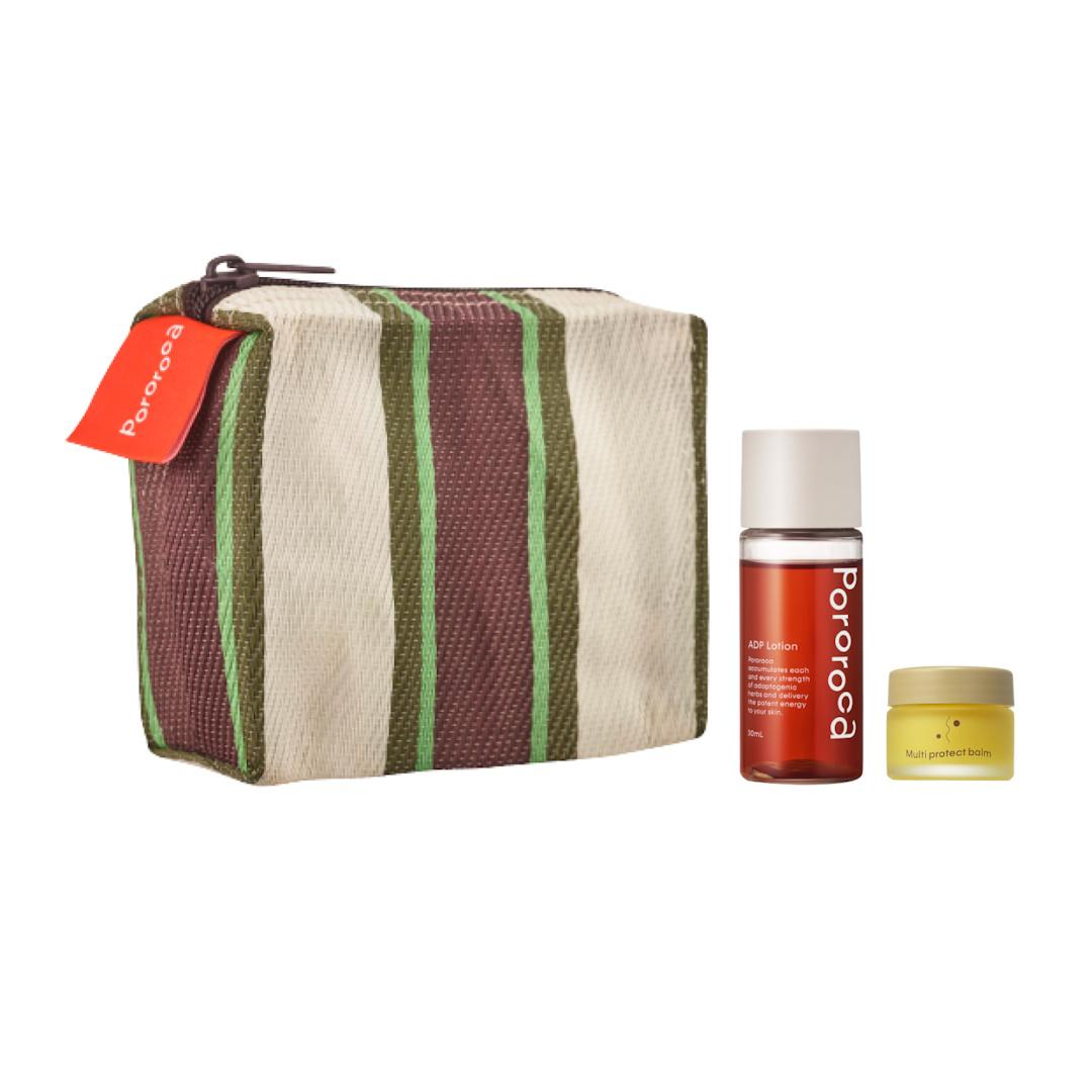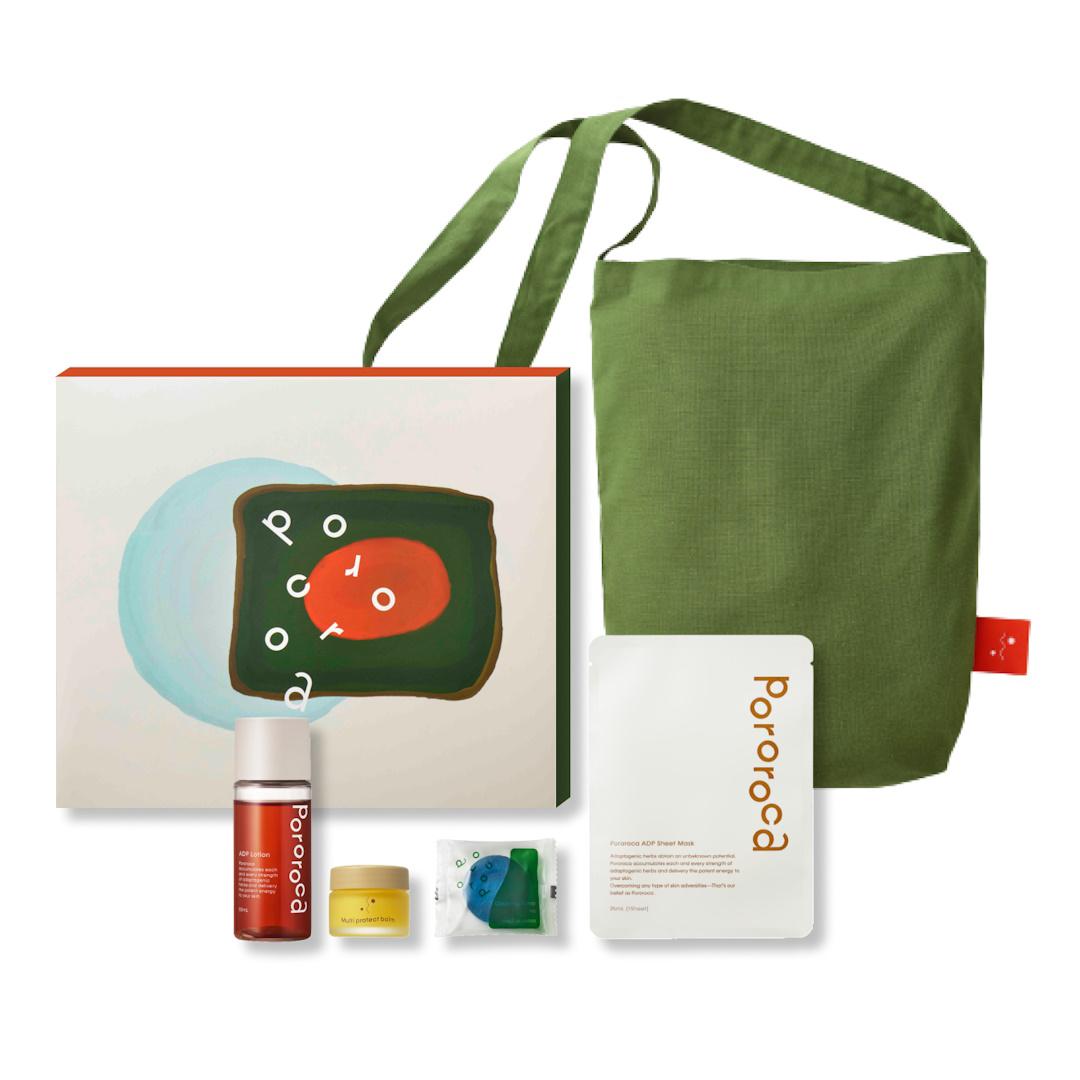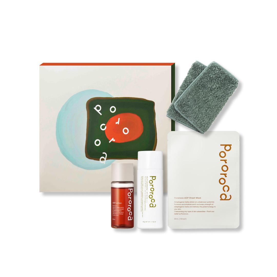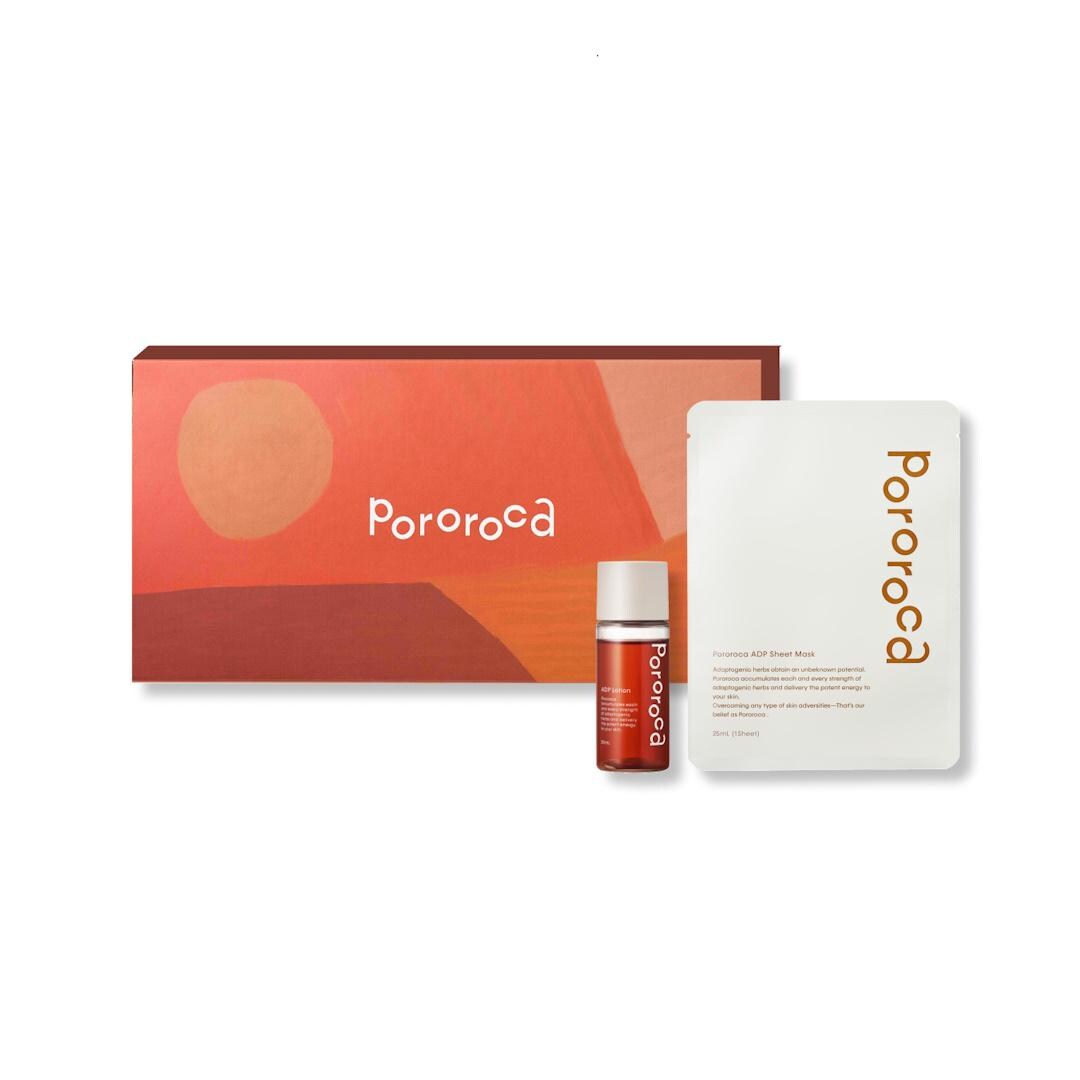 Pororocaを代表するアダプトゲンハーブが5種類入ったADPシリーズの化粧水(ミニサイズ)とシートマスクのセット。肌も心も整え、充実したセルフケア時間を。