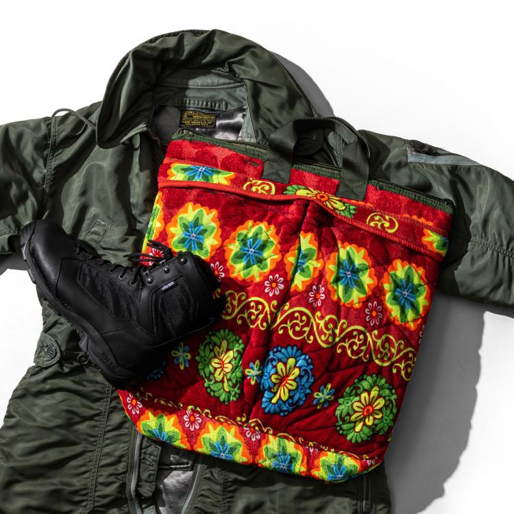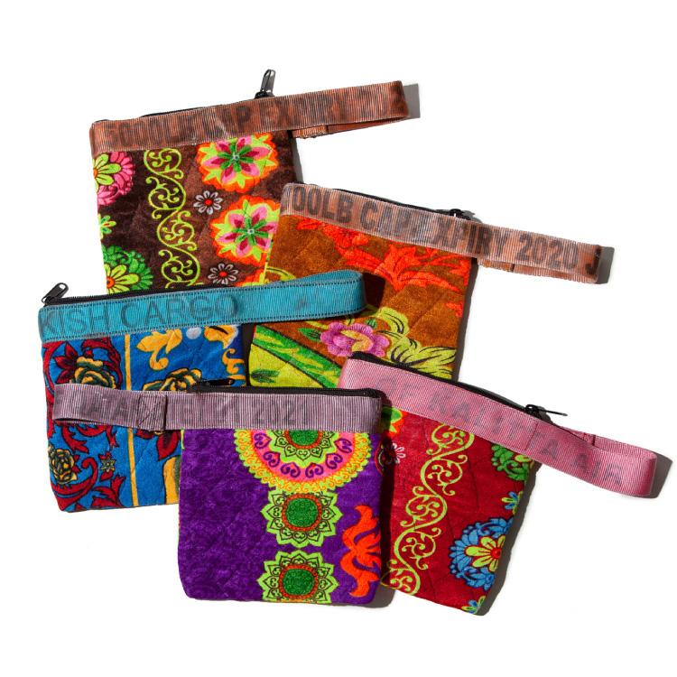 〈PUEBCO〉は、オーナー自らが世界中を飛び回って、そのアンテナに引っかかるものをベースにプロダクトが生まれています。例えば、 「ヴィンテージ スリング ベルト ポーチ」 のベルト部分は空港で使われていた貨物運搬用の頑丈なスリングベルトを使用。ユーズドゆえに、汚れや褪色なども含まれていますが、それが逆に新品にはない味となって、独特の風合いを醸しています。インドで寝具用に流通しているリサイクル生地にキルティング加工を施しているバッグなど、「そこに目をつけたのか!」というバックグラウンドを知るのも、このブランドを選ぶ上での楽しみのひとつです。