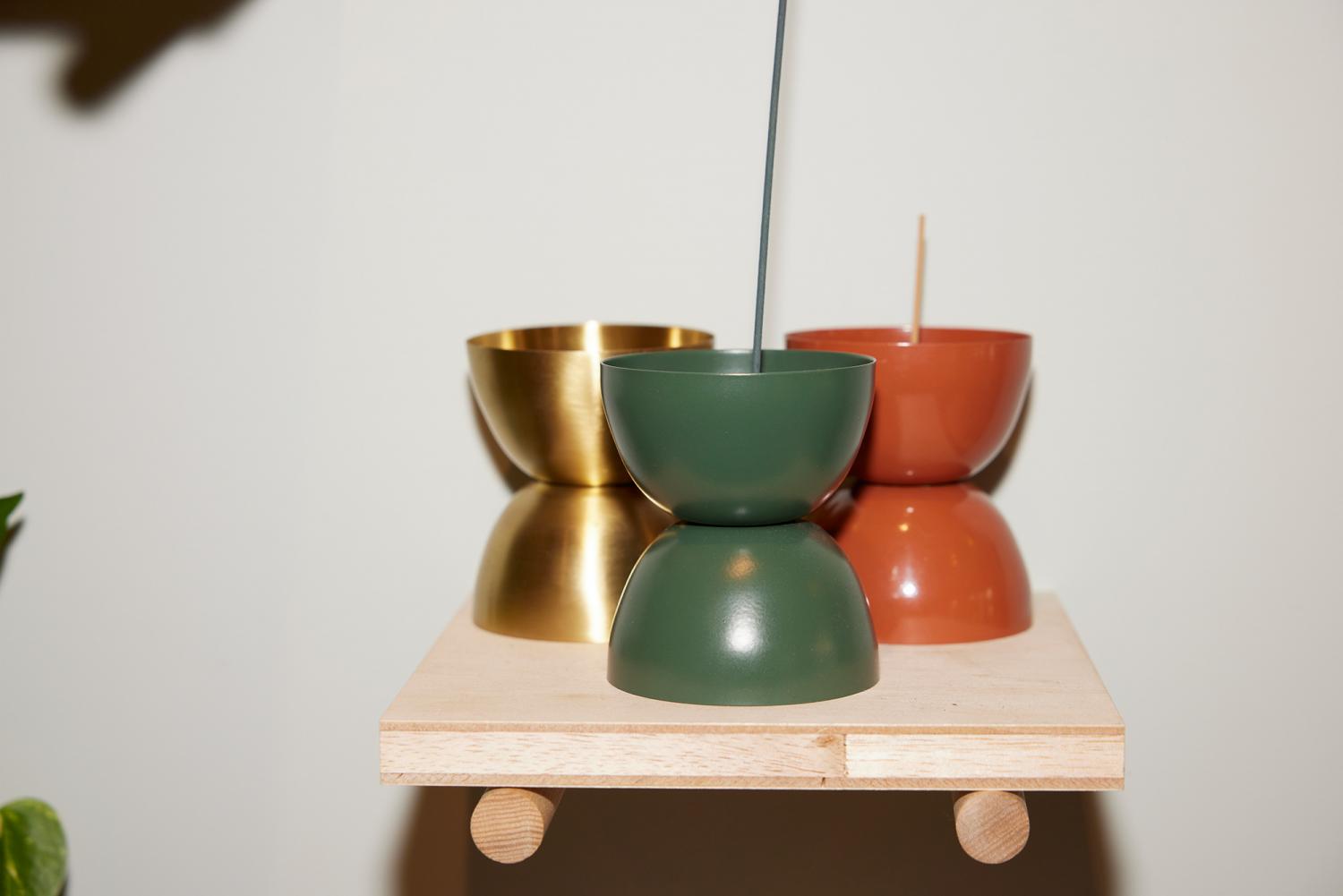 「お香立てには、プレイフルな形に目を奪われる〈Lightly(ライトリー)〉のエッセンスバーナーはどうでしょう? 灰が自然と下に落ちていくので、掃除も簡単で実用的。アルミニウム製で耐久性も抜群です。デザイナーのシンディ・リー・デイビースさんは、色選びがとっても個性的。ヴィヴィッドな2色を組み合わせたプランターもおすすめです」。