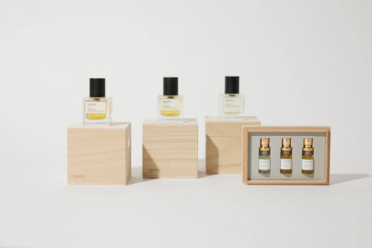 古くから「神聖な木」として神社仏閣などに使われているヒノキ。〈HINOQI TOKYO(ヒノキトウキョウ)〉は、ヒノキの香りを配合し、天然植物成分100%のみで作られた日本国内生産のフレグランスブランドです。お香を大切にする日本の伝統から着想を得たというオードパルファムは、3種類。(写真左から)「No. 8 KEI」は、甘いお香の余韻が広がるフローラルオリエンタルの香り。キリッとした甘みの少ない香りが特徴の「No. 9 ROKU」は、男性にも好まれます。「No. 5 REI」は、静かに降り続いた雨上がりの夜明けをイメージ。グリーンシプレの爽やかな香りが特徴です。ミニサイズがセットになった 「ディスカバリーセット」 は、3種の香りを試してみたい方におすすめ。香水が詰められているハンドメイドの桐箱の美しい佇まいにも癒されます。