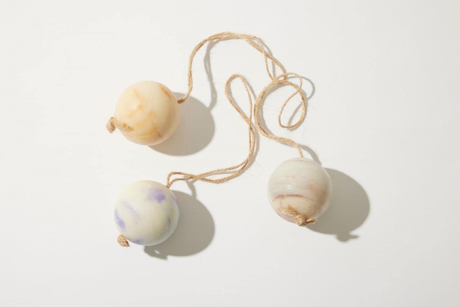 まるで惑星のチャームのような可愛らしいソープは固形型のキッチンソープ。合成界面活性剤不使用で、手にも優しいソープです。(写真左から)爽やかなレモングラスが香る 「オレンジ&レモングラス」 に、フローラルなラベンダー香る 「オレンジ&ラベンダー」 、肌のバランスを整えるゼラニウムの入った 「オレンジ&ゼラニウム」 の3種類です。紐がついているので、キッチンでも場所を取らない便利なアイテムです。