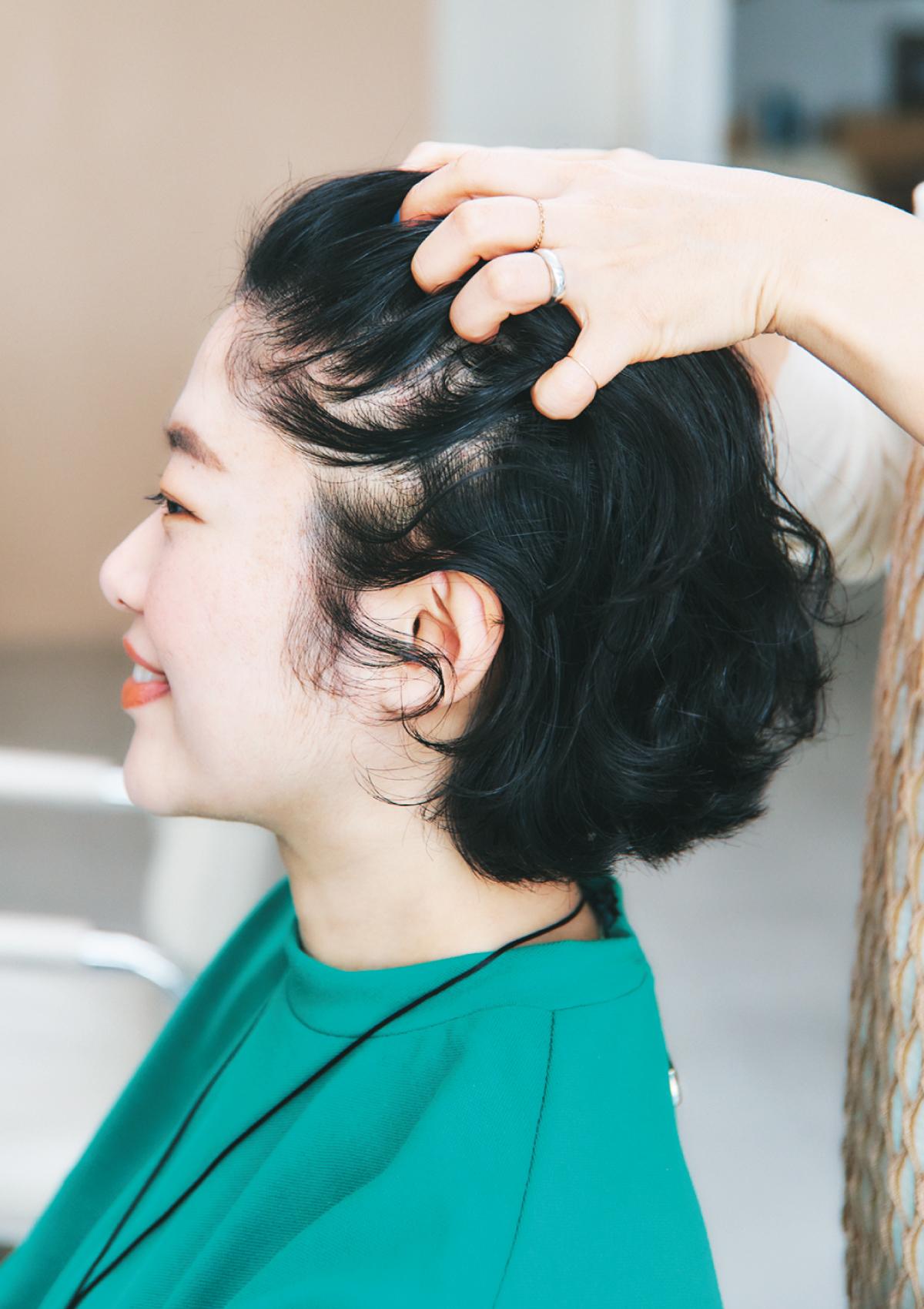 「ハリコシがあるから、湿気ですごく苦しむタイプの髪質ではないけれど、ボリュームが出てまとまりにくい。カット的にもミニマルな方が可愛いから、梅雨時期は油分を入れてあげて、顔周りにはバームでメリハリを出してあげると良さそう」という柳さん。