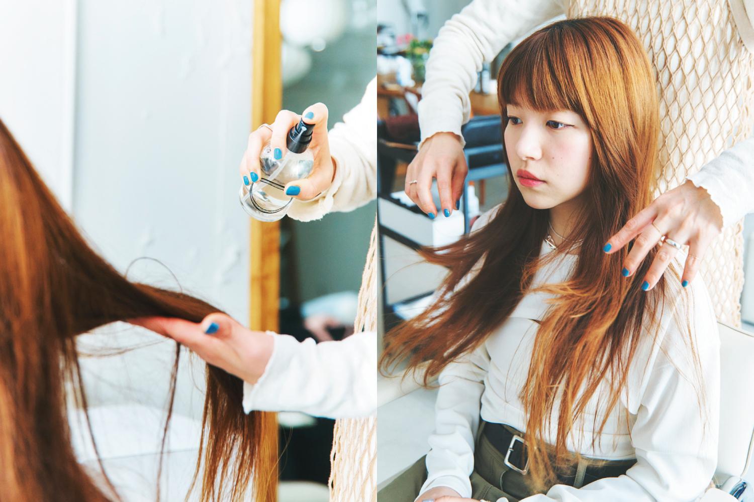 「ロングヘアは、寝癖直しや保湿目的のミストからベタっとする質感を選ぶと、仕上がりが重くなってしまうんです。〈O skin&hair〉のアイテムのように、ベースとなるミストは保湿成分が強く、油分が控えめなものを選ぶと良いと思います。