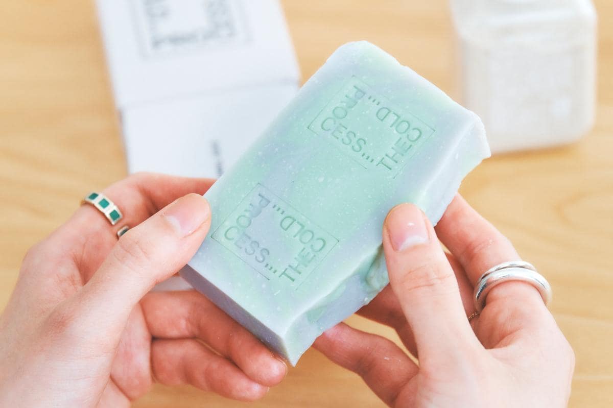 池田:私も石けんをひとつ選んでいて、〈THE COLD PROCESS(ザ・コールドプロセス〉ってブランドの「ハトムギ&シダーウッド(フェイス)」。これなんですけど、色がすごく可愛くて。