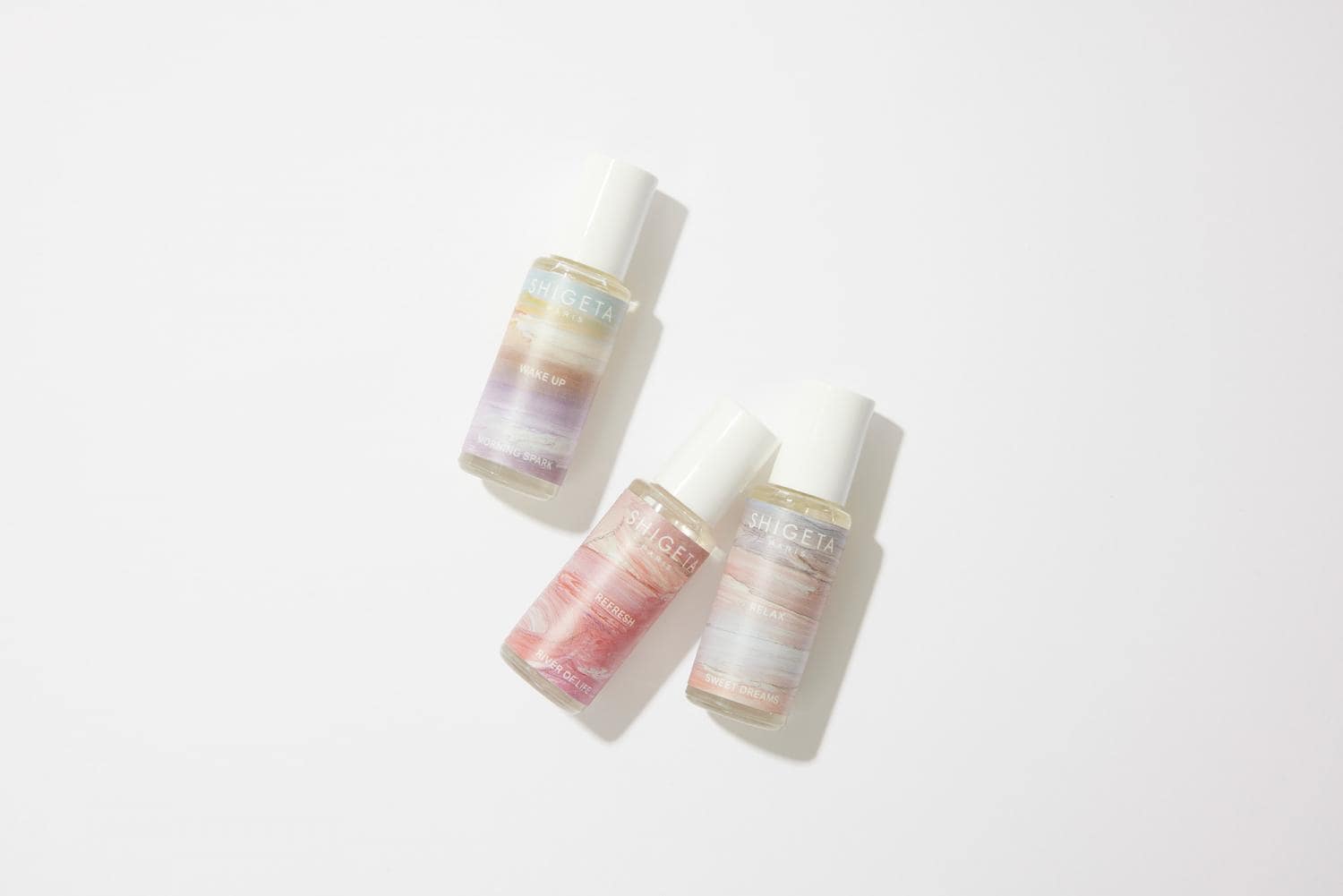 〈SHIGETA PARIS(シゲタ パリ〉)の新作アイテムは、外出先でも気軽に気持ちを切り替えたいときに使える、スマートな ロールオンオイル 。アートディレクターHana4氏が描き下ろしたパッケージデザインは、3種類の香りをそれぞれのシーンに合わせて色彩で表現。 (写真左から)ポジティブな気持ちを取り戻したい時は「モーニングスパーク ウェイクアップ(01)」を。まるで朝日のようにエネルギー溢れるパッケージの色彩が、目を覚ませてくれるよう。 ローズマリーやペパーミントなどの香りがリフレッシュさせてくれる「リバーオブライフ リフレッシュ(02)」。緊張している時、そっと気持ちに寄り添ってくれるお守りのような一本です。 頭をフル回転させた後や、旅の途中で疲れが溜まった時は「スウィートドリーム リラックス(03)」が心の癒やしに。穏やかな色彩のパッケージや、ラベンダーやマジョラムなどをブレンドしたエッセンシャルオイルがリラックス効果をもたらします。