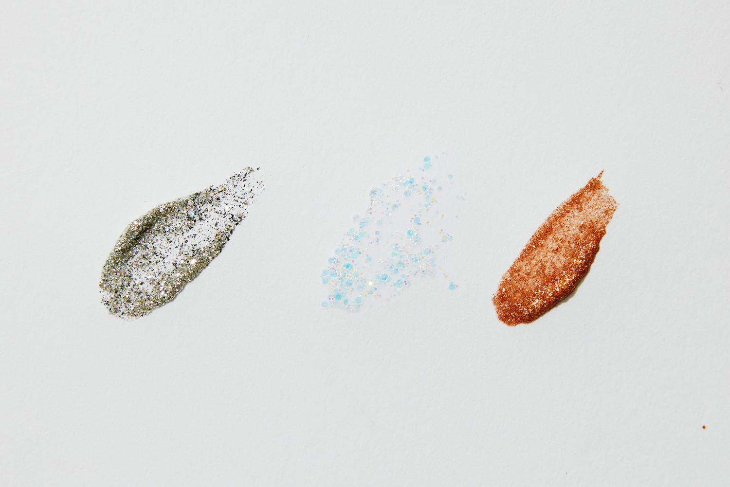 ウォーターベースの リキッド グリッター は、ミラーボールを思わせるようなラメの「02 TGIF(94)」(写真左)と、オーロラのホログラムが入った「01 Eternal Reflection(93)」(写真中)、肌なじみの良いコッパーカラーの「03 Ante Up(90)」(写真右)の3色。