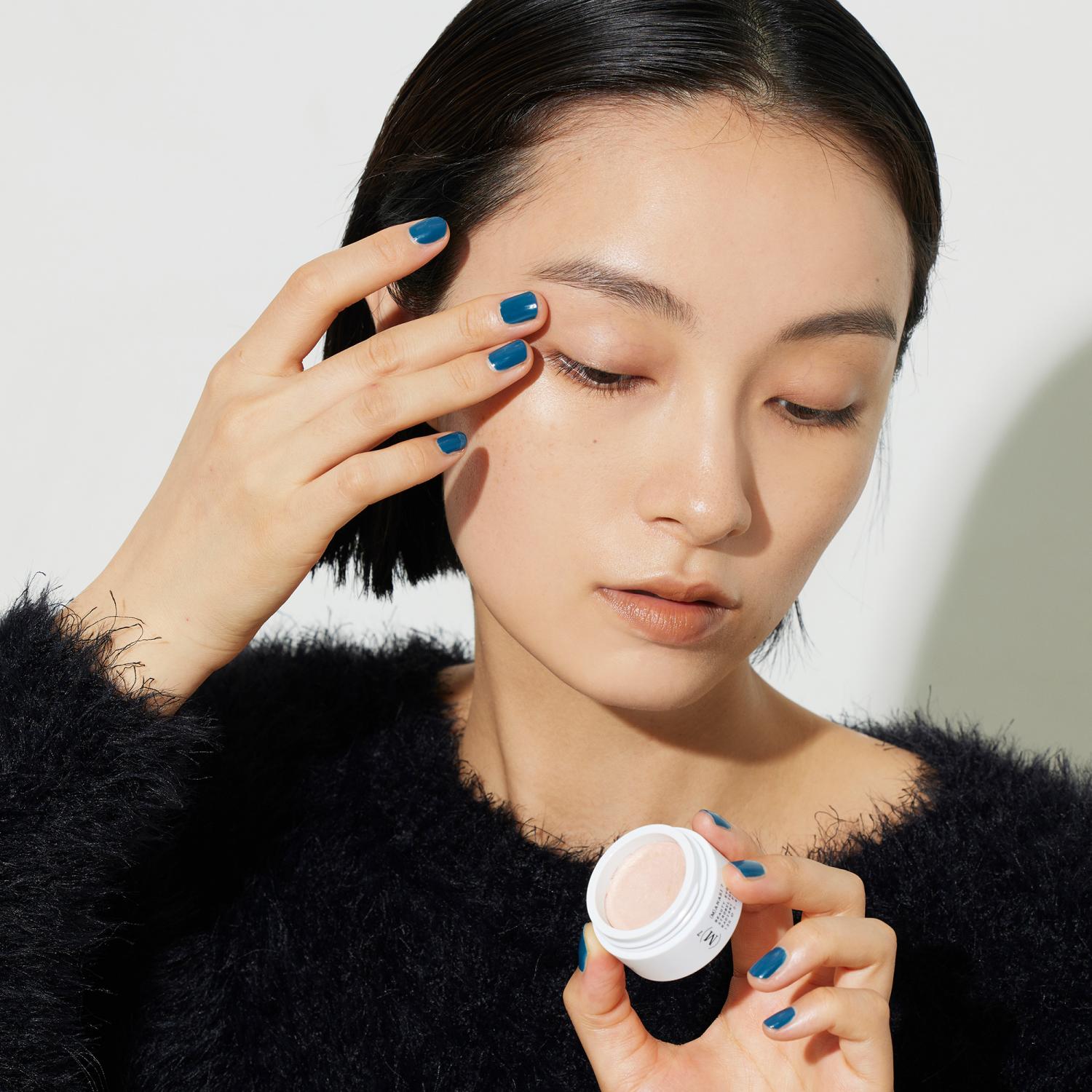 2. 顔に立体感を持たせるために目尻横のCゾーンに〈Manasi7〉の ハイライター 「Sunrise (63)」をオン。ピーチパールピンクの色が肌に馴染み、柔らかな光をまとったようにさりげないツヤが生まれます。