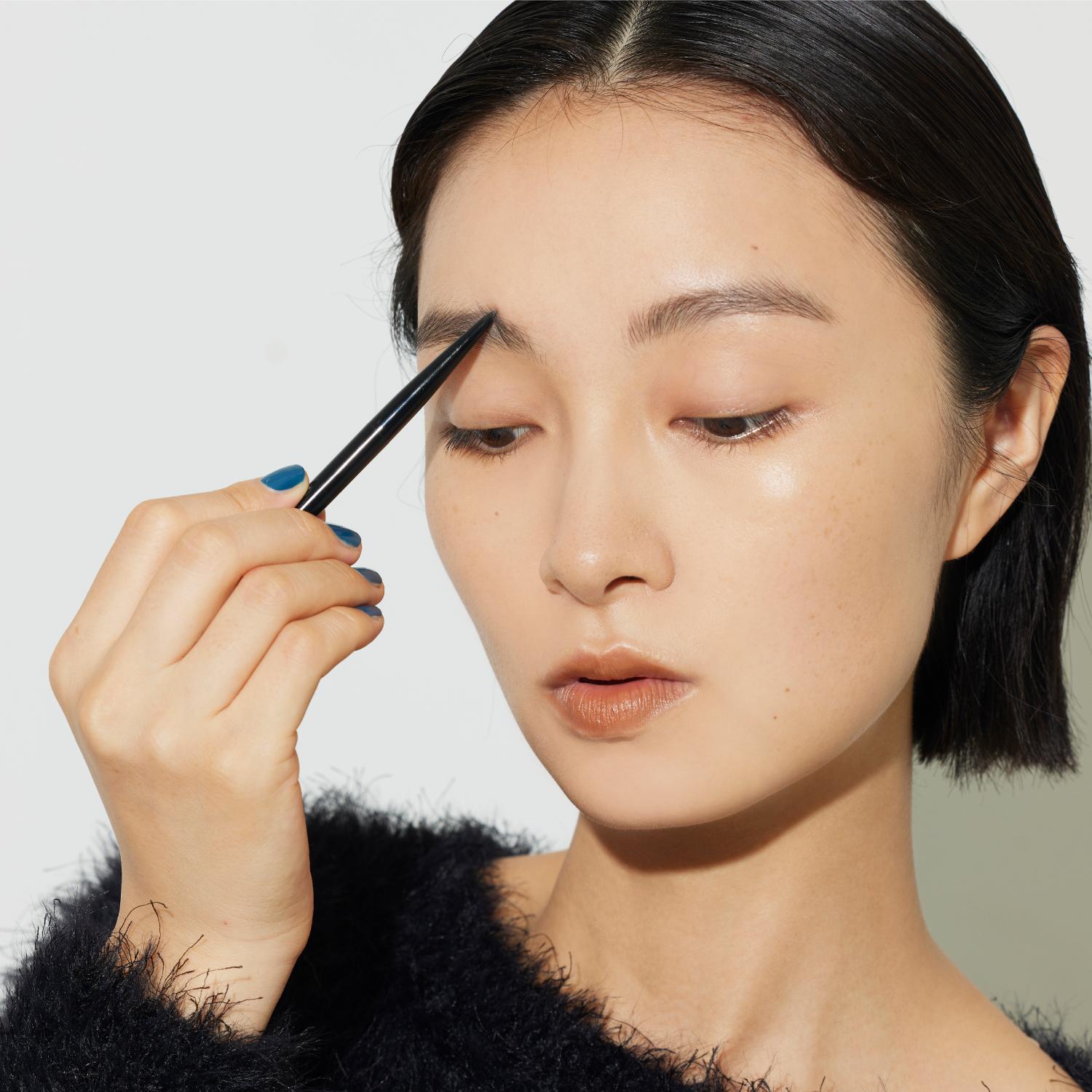 1. 0.9mmの極細ラインがするする描ける〈PARISBROW〉の スリムブロウペンシル で、眉の毛が足りない部分に毛を1本1本足すように描く。「オリーブグレー (07)」なら肌馴染みがいいので、優しい雰囲気もまとった立体眉が作れます。