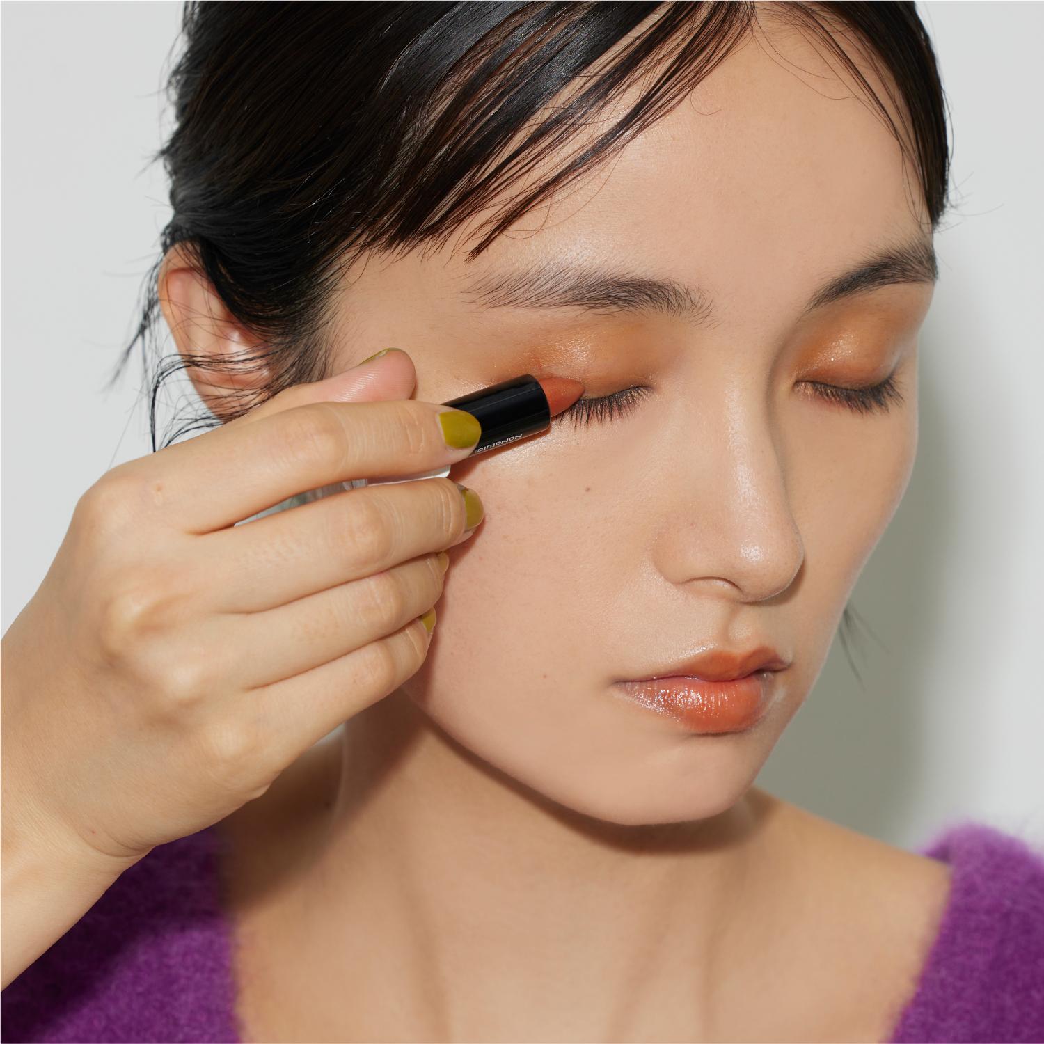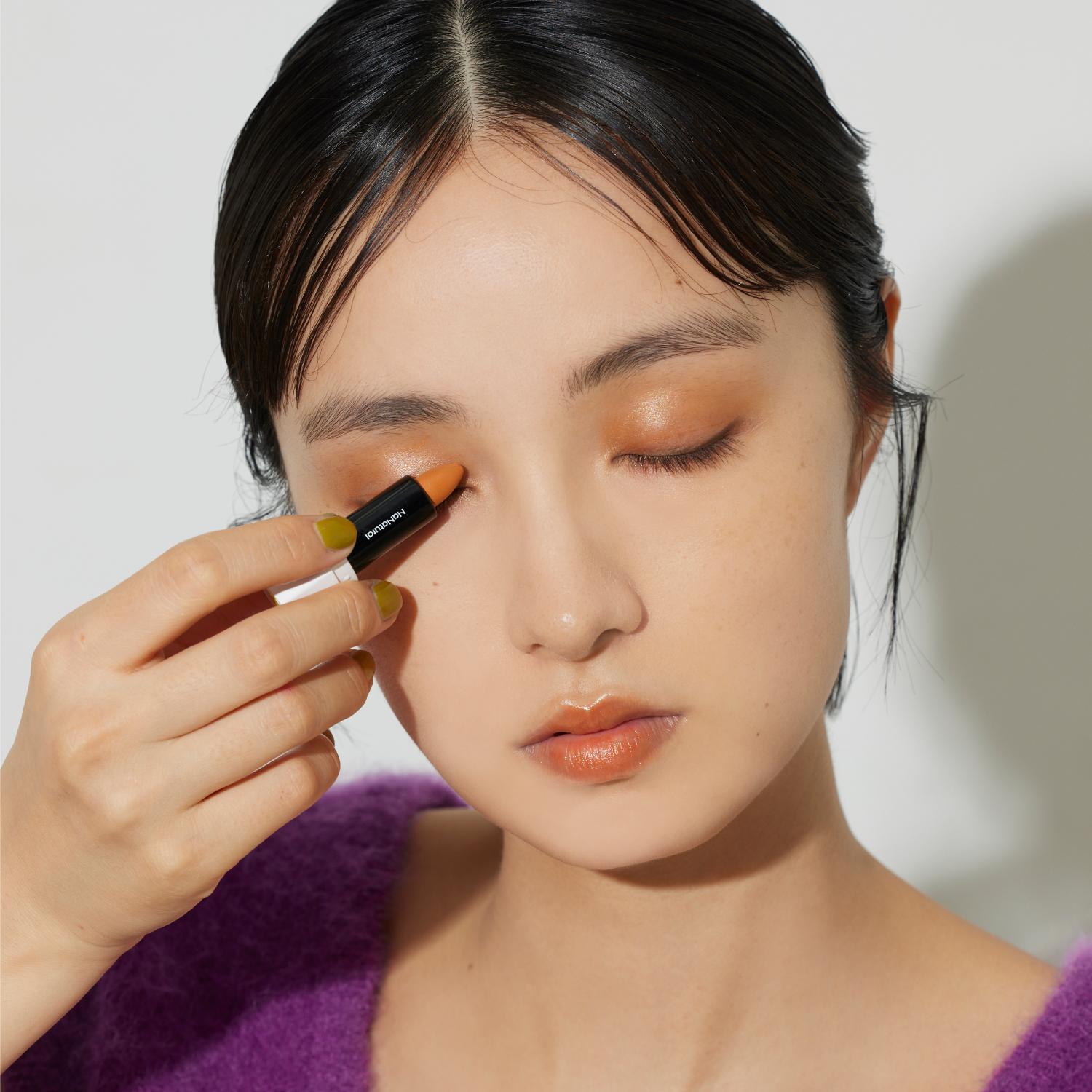 2. 締め色として〈7NaNatural〉の カラースティック 「01 ダイダイ (70)」をまぶたの際よりも少し広めにアイラインを引くようにのせる。ゴールドのメタリックが自然なツヤと血色を生み出します。