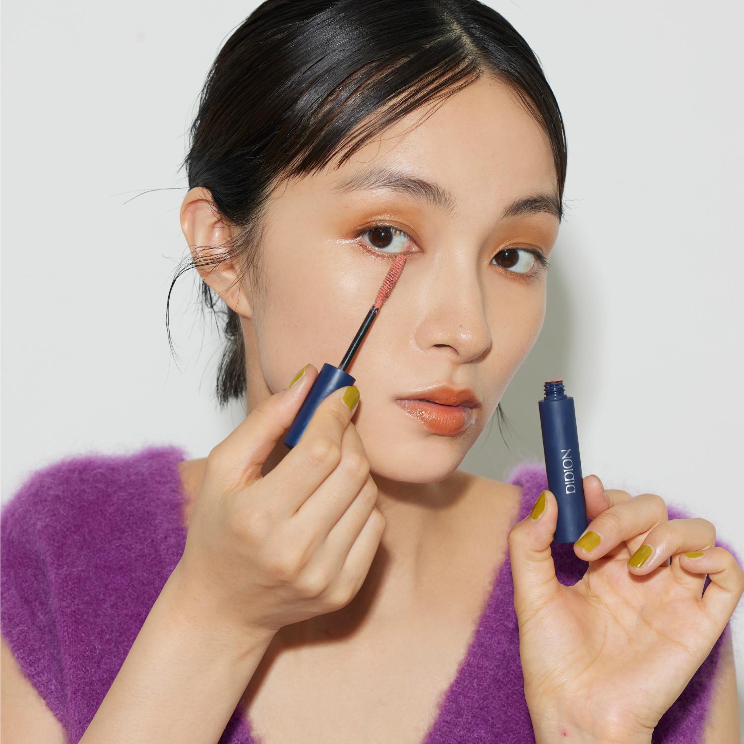 カラーを全体にまとっているのに、やりすぎ感がないのは透け感とほんのりと濡れたようなツヤ感のおかげ。カラーラインやカラーマスカラは主張するのではなく、「仕込む」というマインドで下まぶたメイクをすると、遊び心があるのに、子供っぽくならずに仕上がります。カラーメイク×カラートップスの日は、ノーアクセでメイクをアクセサリー代わりに。