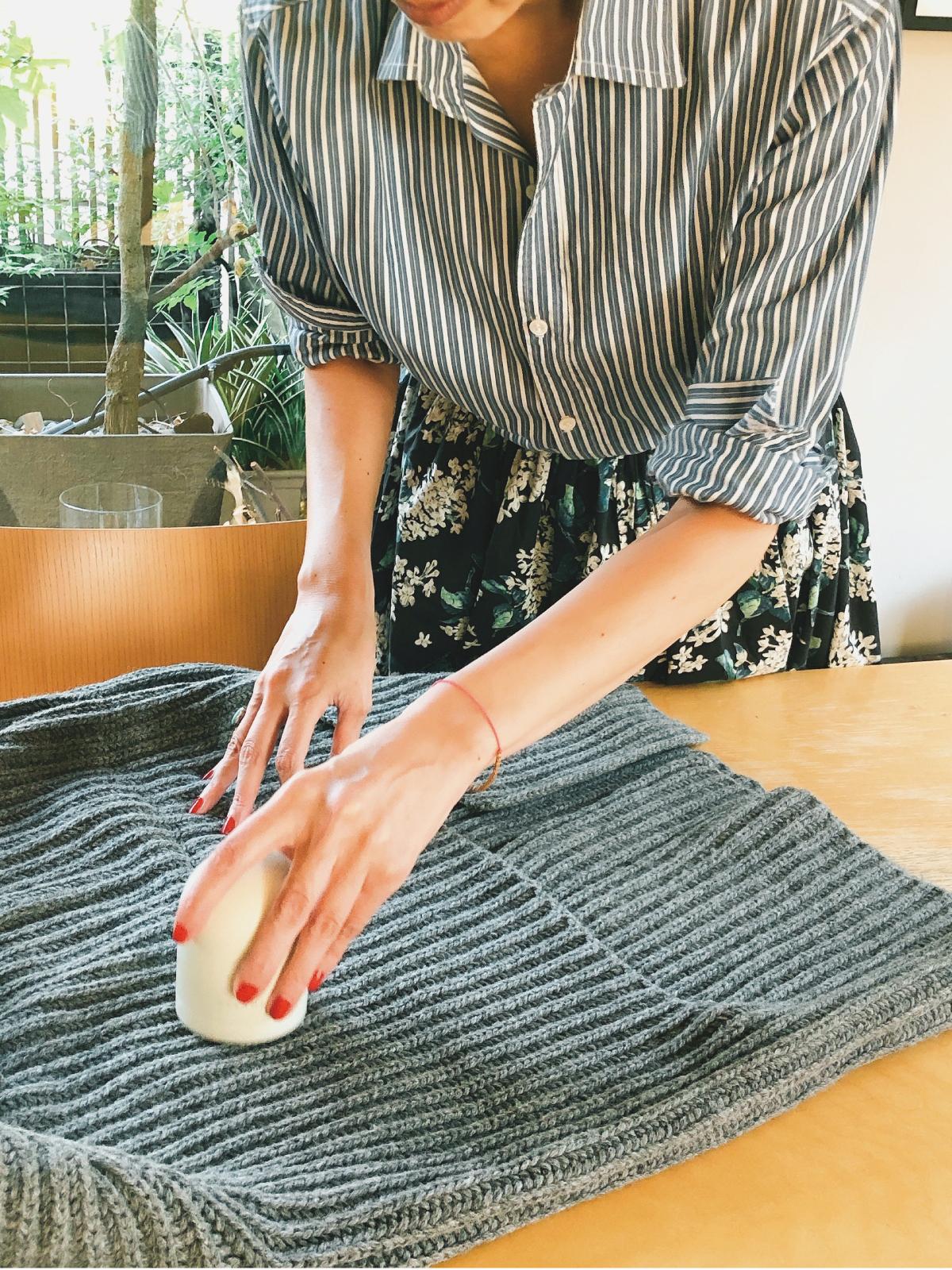 A. 今回はローゲージニットで試してみましたが、円を描くようにシェービングすると、大きめの毛玉もおもしろいように取れ、毛玉’sハイになりそうでした。薄手のニットやタイツなどは当てすぎると素材を傷つけてしまう場合があるので、平らに伸ばし、毛玉ができている箇所にピンポイントであてるのがよいでしょう。また、コードレスなのでどこでも使えてとても便利。コードレス=馬力がない説を信じていましたが、〈STEAMERY〉の毛玉クリーナーを使ってみてその印象が覆されました。