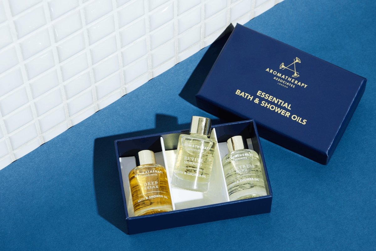 1ボトルで約3〜4回使えるミニサイズがセットになった、〈AROMATHERAPY ASSOCIATES(アロマセラピーアソシエイツ)〉のバス&シャワーオイル。エッセンシャルオイルは、栽培からこだわったオーガニックの植物がベースに。モーニング、マインド、リラックスの3種の香りは朝晩で使い分けるのもおすすめです。上品なネイビーの箱に入ったガラスボトルのオイルは、ギフトにも喜ばれるはず。