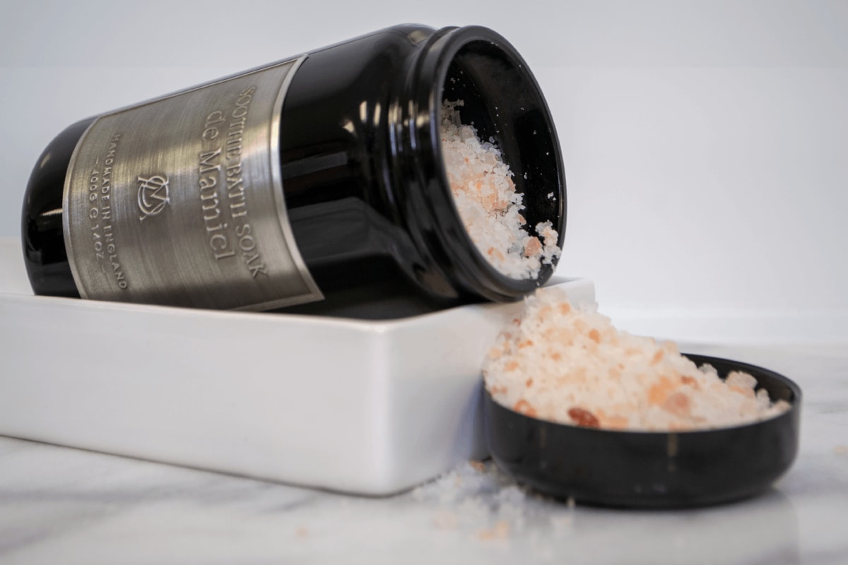 ミネラル豊富なヒマラヤ岩塩と、リラクゼーションを促すエプソムソルト、乾燥した肌を保湿するデッドシーソルトの3種類の塩をブレンドした〈de Mamiel(デ・マミエール)〉のバスソーク。良質な睡眠に欠かせないマグネシウムや亜鉛などの成分がバランスよく含まれています。睡眠に特化した「ナイト&デイオイルシリーズ」の「SootheスーズオイルS」と同じ精油を使用したソルトは、安息香とも呼ばれるバニラのような芳醇な香りが特徴です。