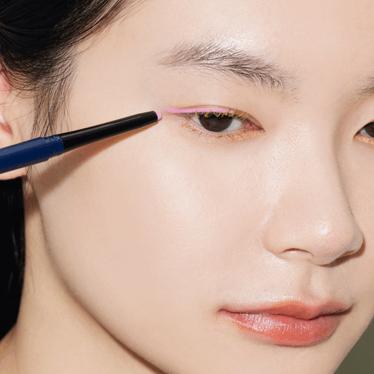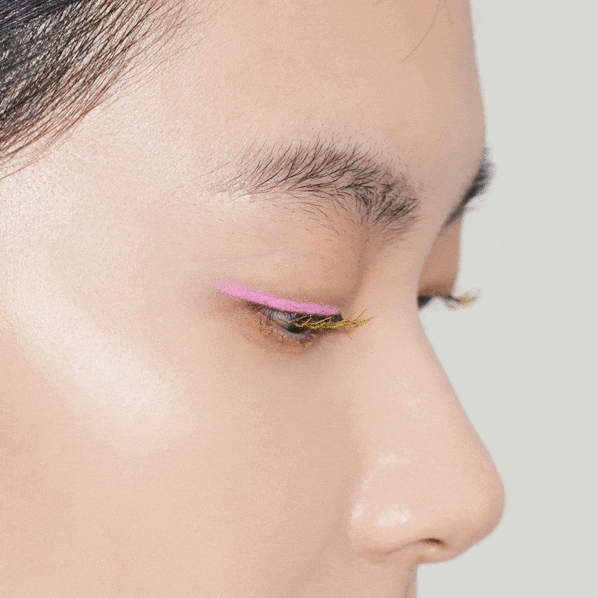スムース カラー アイライナーは上下で2色使い。 ヴィヴィッドなピンクの「01 Sugar Lala (63)」はアイシャドウがわりの感覚でオン。目を開いた時にもカラーがのぞくように黒目から目の際にかけて、太めに引く。 下瞼には、ゴールドのラメが入った07 Golden Hour (86)」を。マスカラと同系色のカラーを足すことによって上瞼のピンクがより引き立つように。