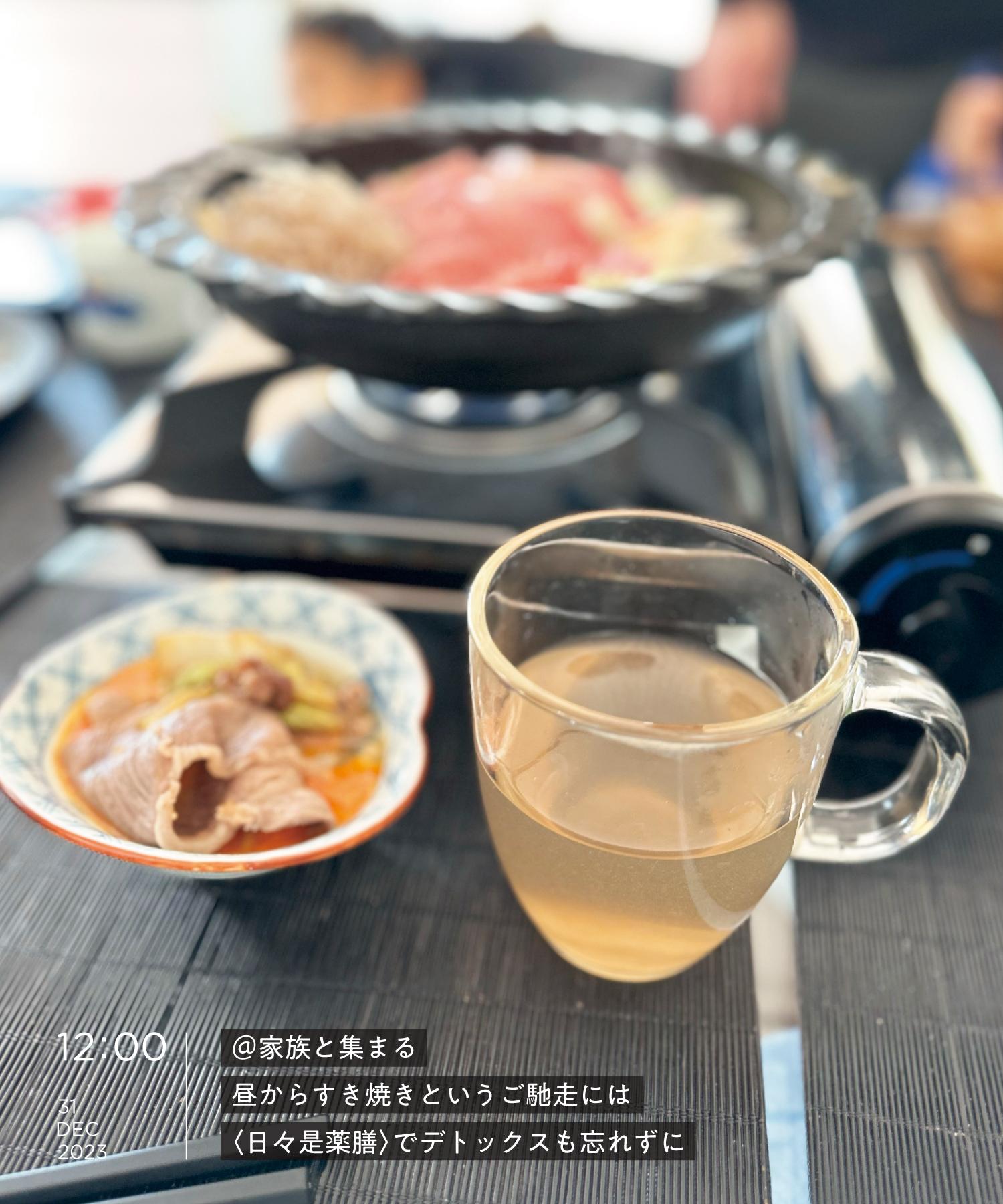 年末ならではの豪華な食事。ありがたいけど悲しいかな、良いお肉の脂が重たく感じてしまうお年頃。という訳で、〈日々是薬膳(にちにちこれやくぜん)〉の「排毒茶」を意識的に飲むことに決めておりました。トイレに行く回数も増えて、なんだかいい感じ。いつもの重い食事の後のもったり感がなし。なんでも真似したい我が家のチビも「ちゃちゃのむ」と欲しがってごくごく。子どもにも飲みやすい味なよう。