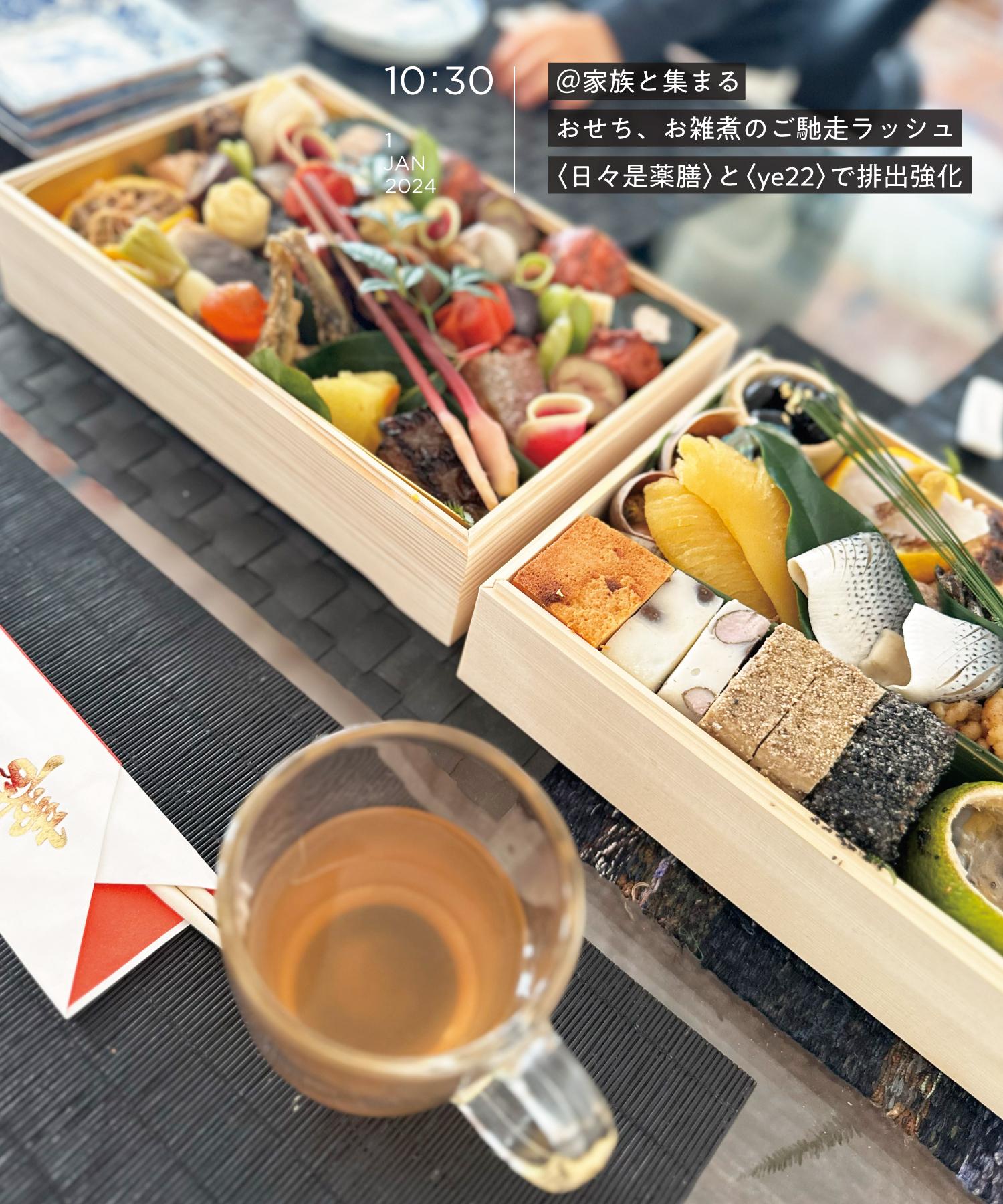 あけましておめでとうございます。元旦といえば、おせちにお雑煮とご馳走が総出で胃腸に猛攻撃を仕掛けてくる一日。昨日、「排毒茶」に助けられた実感があったので本日もお供に。初詣帰宅後は小腹が減り、子どもたちに隠れてキッチンできなこあんこ餅を立ち食い。〈ye22〉の「ハーバルティー モルジュ」の程よい酸味で甘くなった口の中をさっぱりさせながら、排出意識(矛盾する行為)。お雑煮などもたらふく食べたけど、デトックス系のお茶を1日中ガブ飲みしたせいか、胃がヘビーな感じにならずに過ごせました。夜もなんとなく、ぐっすり眠れた気がしております。