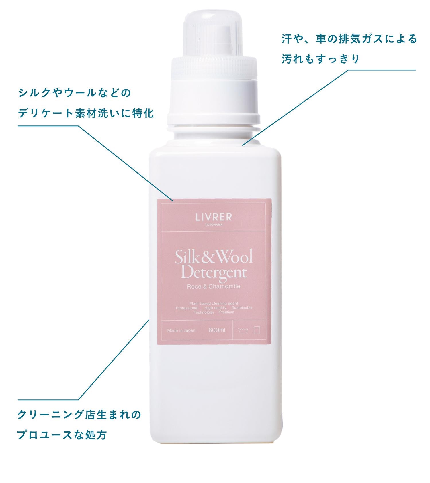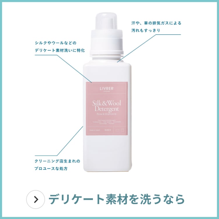 「〈LIVRER yokohama〉では、クリーニング店で培った知見や知識を生かしたプロダクトをラインナップ。デリケート繊維洗いに特化した洗剤『SILK&WOOL DETERGENT』も、プロユースな洗濯洗剤を一般の家庭でも使用できるようこだわって開発しています」2. シルクやウールなどのデリケート素材洗いに特化