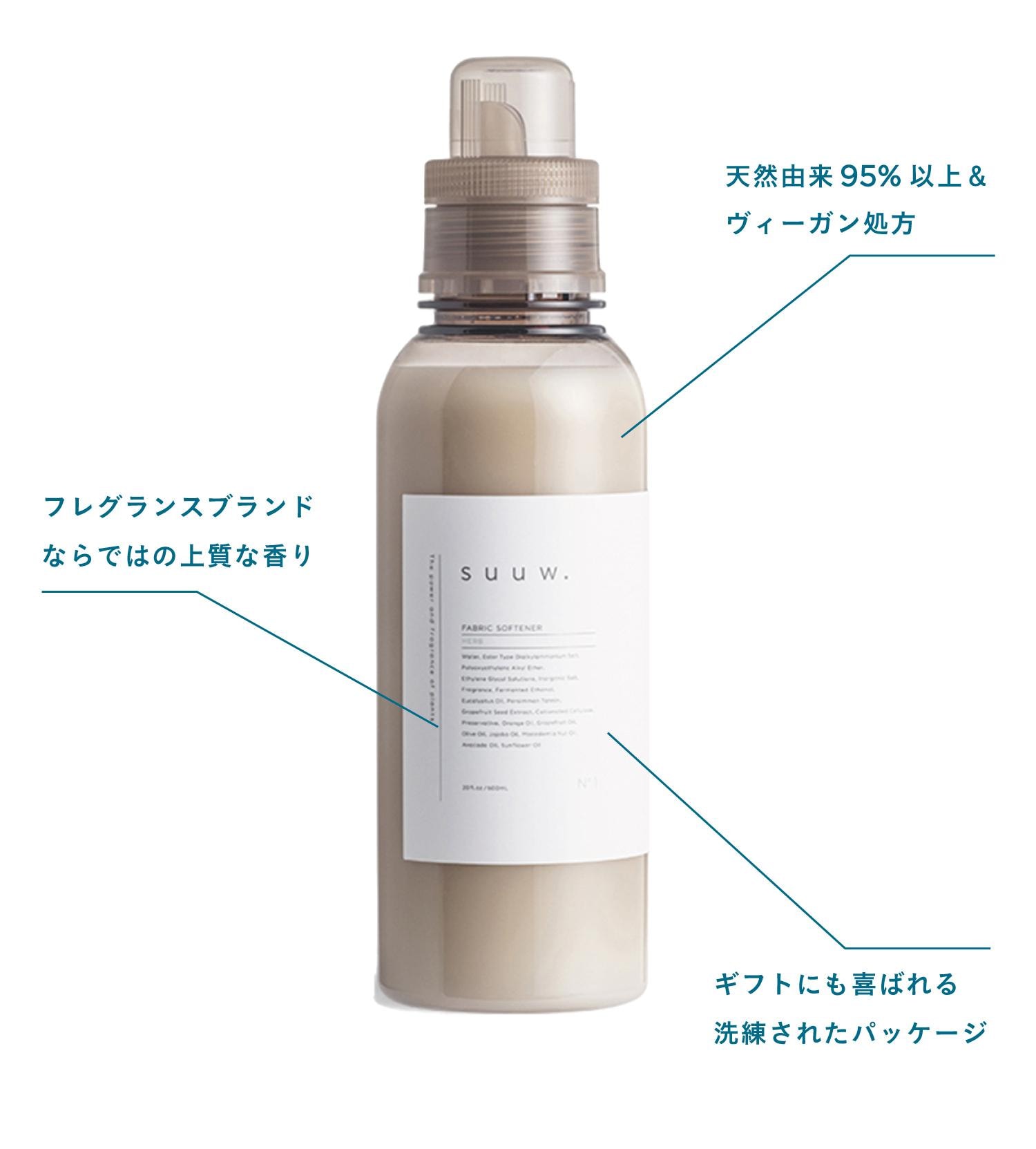 「オリジナルで作成したグレージュカラーのボトルと、ミニマルなパッケージも注目してもらいたい点。抜け感のある絶妙な色味のソフナーはユニセックスに使用いただけ、インテリアにも馴染むデザインです。ギフトとして贈っても喜ばれます」suuw.ってどんなブランド?