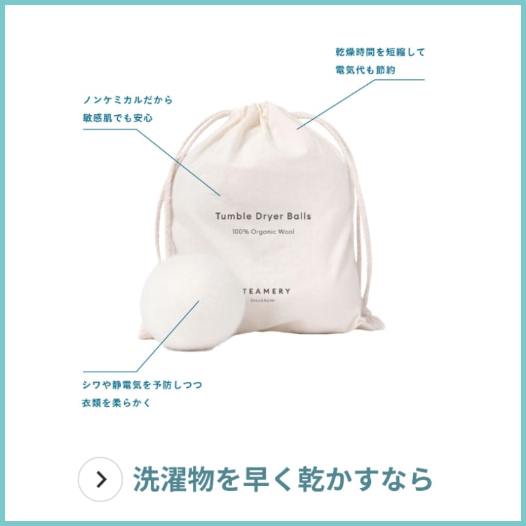 「乾燥機の中で回って効率よく衣類の水分を吸収してくれるので、乾燥時間の短縮にも役立ちます。電気代の節約をすることもでき、何度も繰り返し使えるエコなアイテムです」3. ノンケミカルだから敏感肌でも安心