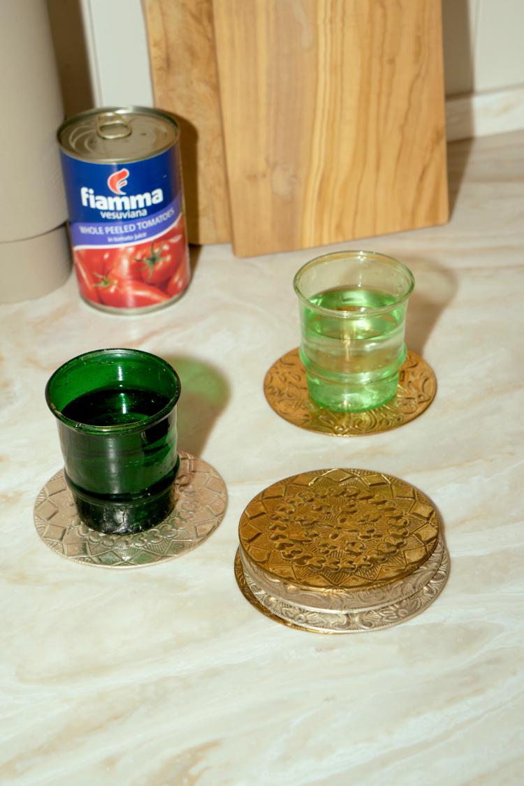 コースターは真鍮で使いこむほどにその人独自の経年変化が楽しめるアイテム。グラスも手吹きで制作されているため、異なる気泡の入り方など1点1点個性があります。グラスは女性も持ちやすい大きさで出っ張りの部分が指に引っかかり持ちやすく、デイリーテーブルウェアにピッタリです。