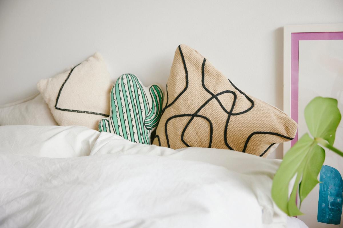 シンプルに白を基調にしたベッド周りは、グラフィカルなクッションカバーとサボテンとライオンのぬいぐるみで遊び心をプラス。