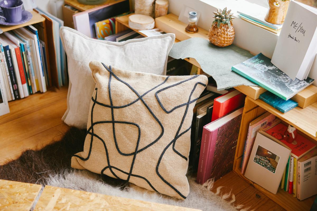 「仕事で扱うからか、高価なブランドものに憧れることがあまりなくて(笑)。それよりも自分の身の丈にあったものを見つける宝探しみたいなことが好き。古着屋さんや旅先でピンときたものなど、何でもないものに価値を見出すことが面白いと思っています。ローテーブルは前の家のウォークインクローゼットで使っていた木の板を自分で張り合わせたもので、ラグは旅先のチュニジアで価格交渉の末に、現地価格で手に入れたものです」。