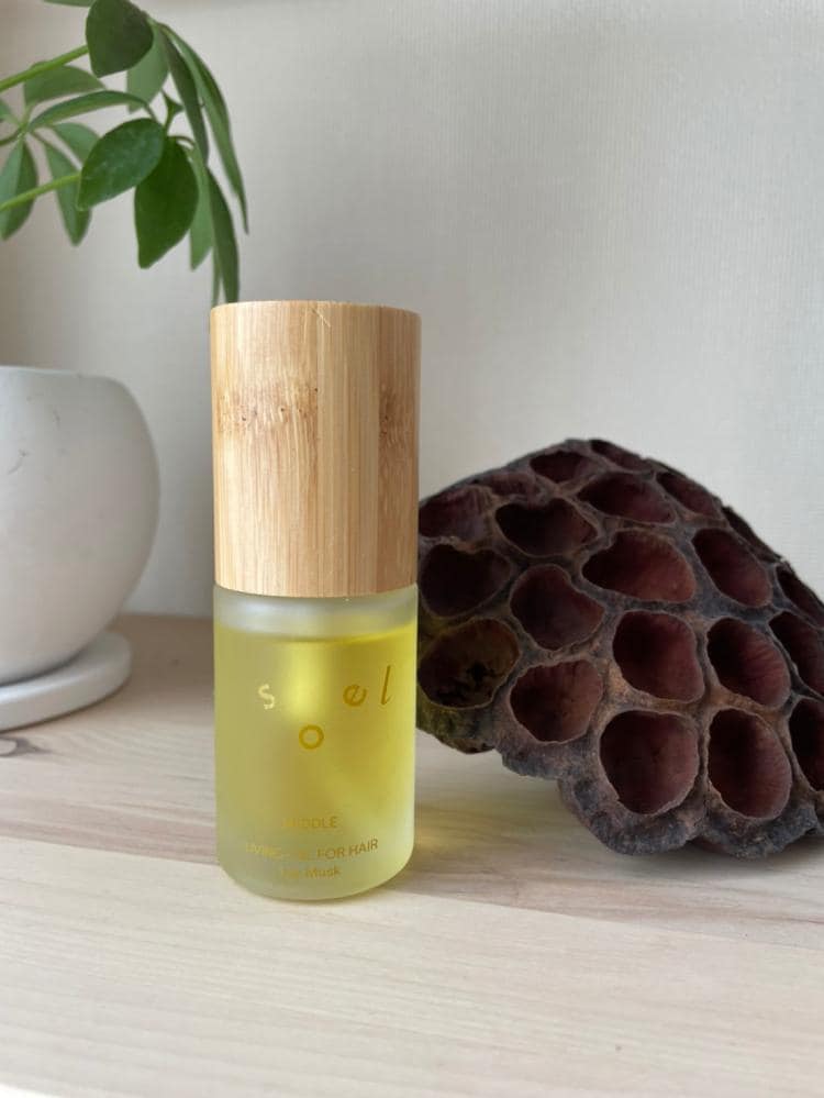 バームやオイルでスタイリングすることが多めだというTOMOKAさん。パーマやカラーによるダメージやハリのなさが気になっているという彼女は、〈soel〉のヘアオイル「リビングオイル フォーヘア Lily Musk」をトライ。厳選された天然植物由来のオイルが毛髪内部と外部からアプローチし髪に潤いや柔軟性をもたらしてくれるオイルは、パーマやカラー、脱色などによるダメージに悩む人にもおすすめ。スタイリング剤としてもヘアケアアイテムとしても優秀な一品です。