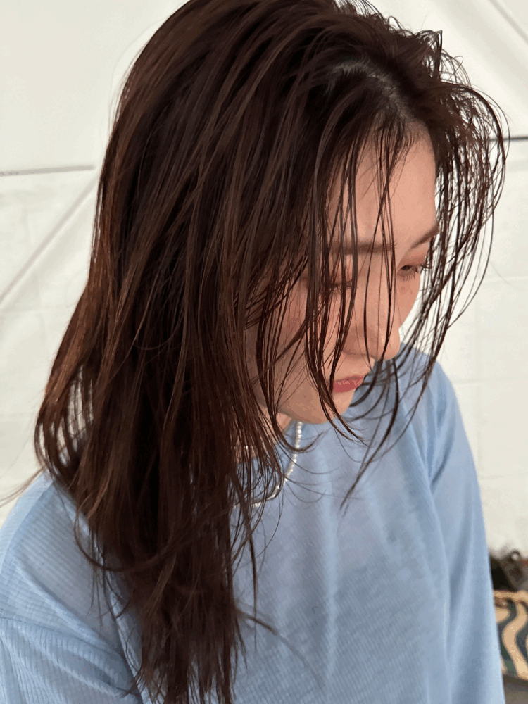 TOMOMIさんの定番は、ラフでウェットな質感のニュアンスヘア。オイルワックスを使ってスタイリングすることが多い彼女には、今回〈TAU〉の「モイストセラムバーム」を試してもらいました。美容成分をたっぷりと含んだバームは保湿力が抜群。パサつきやダメージが気になる髪をケアしつつ、スタイリングができる優れものです。