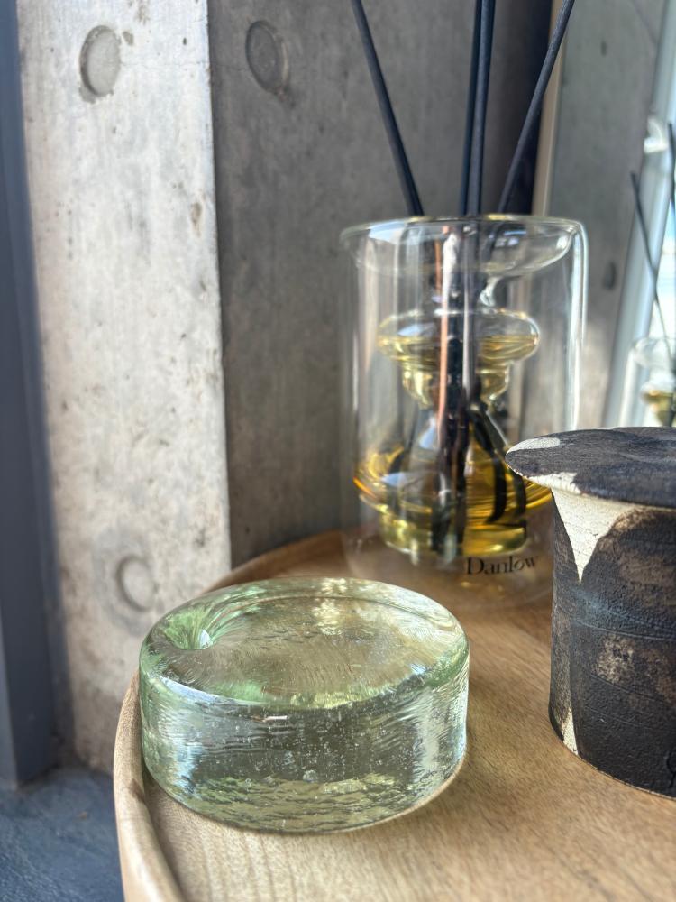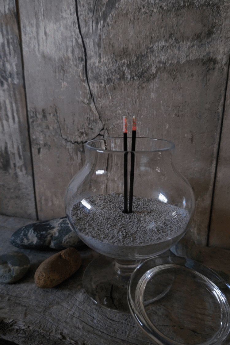 ガラス特有の冷たい印象はなく、厚みのあるガラスの中の気泡や心地よい重みには、もはや暖かさを感じるほど。燃焼時間が15分ほどのインセンスに使用するとちょうど良く、ふき取りで灰をきれいに落とすことができるため、お手入れも手軽で永く愛用いただけます。